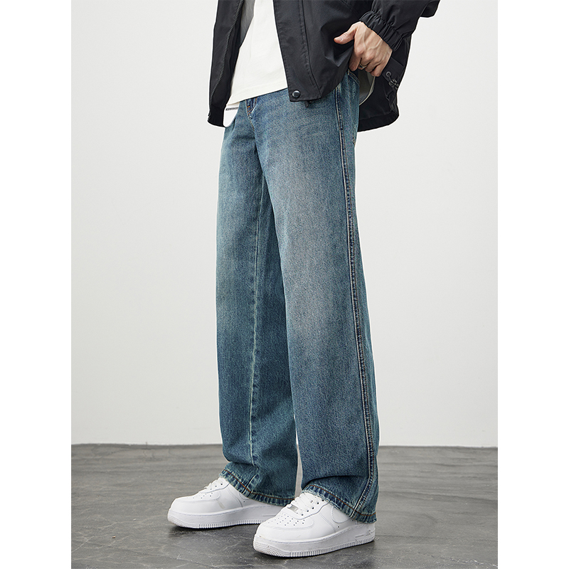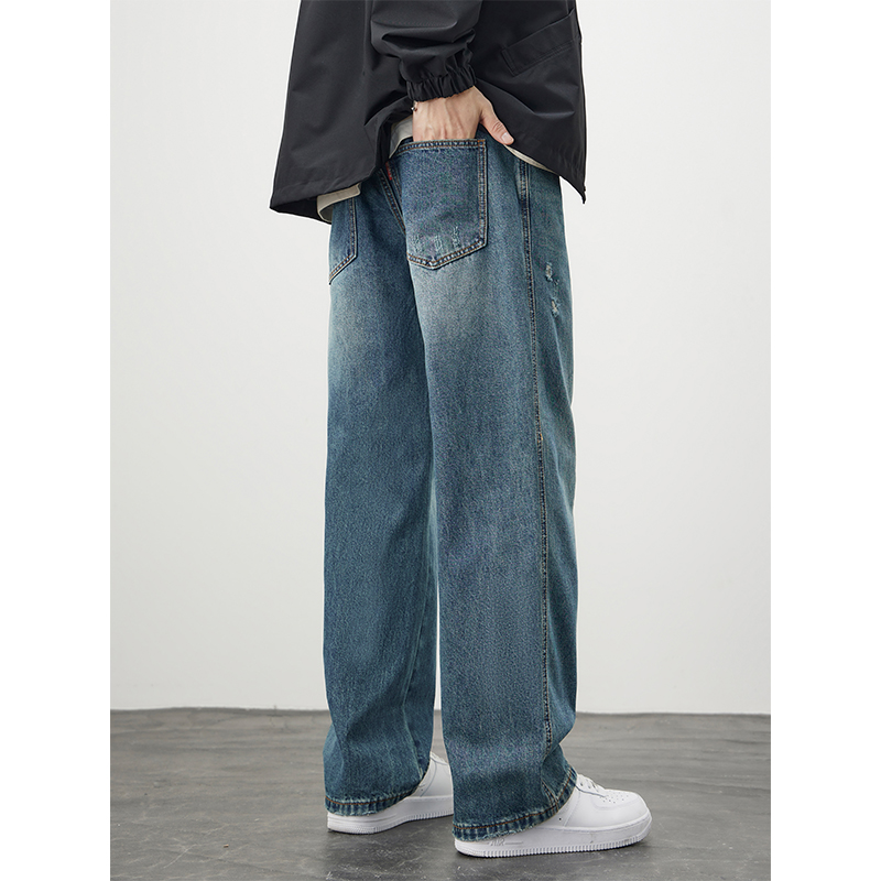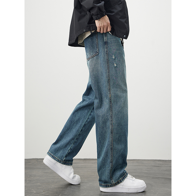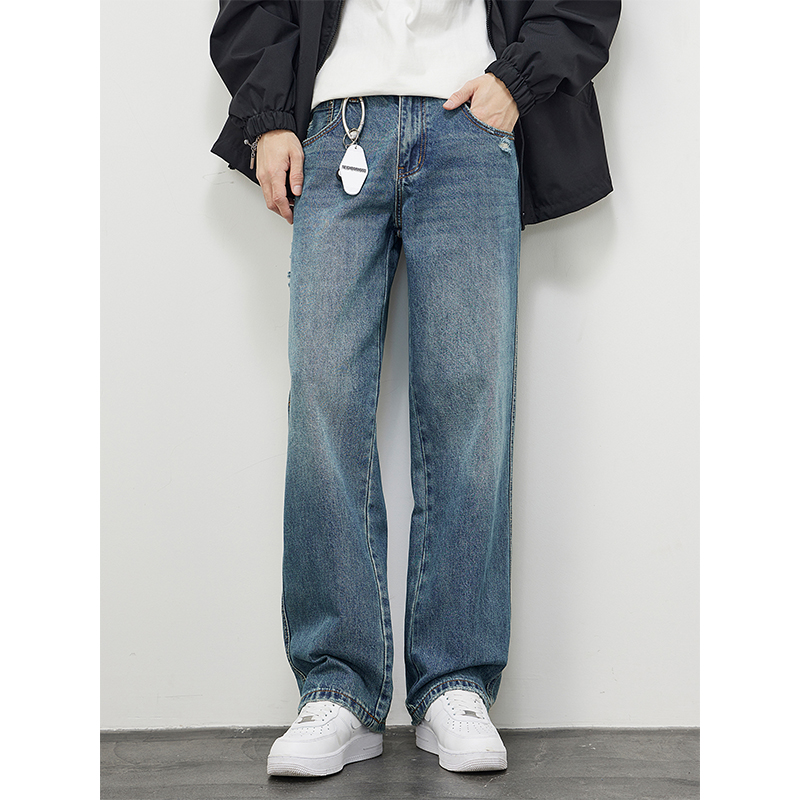 Kuvine2025秋季 男潮 棉感宽松直筒休闲简约cleanfit水洗刮烂牛仔裤