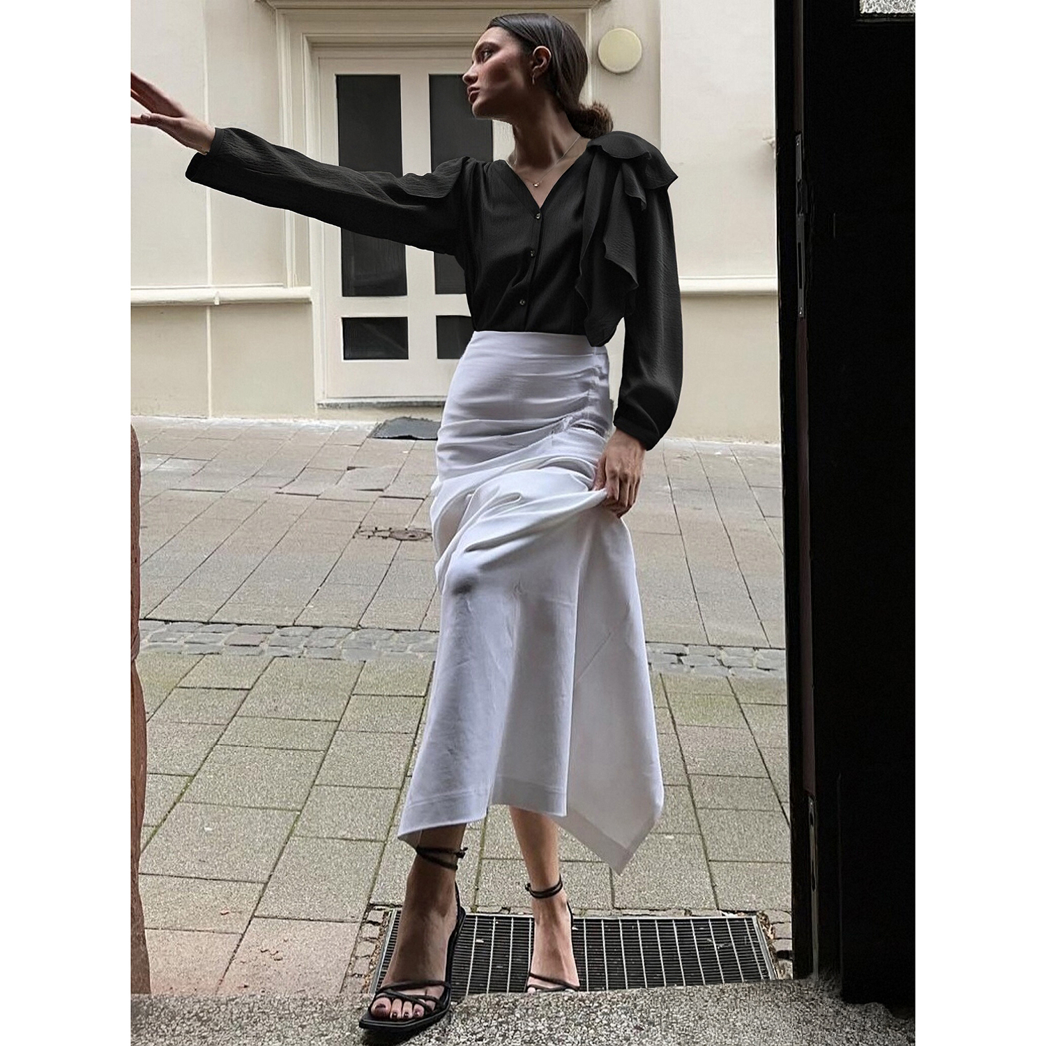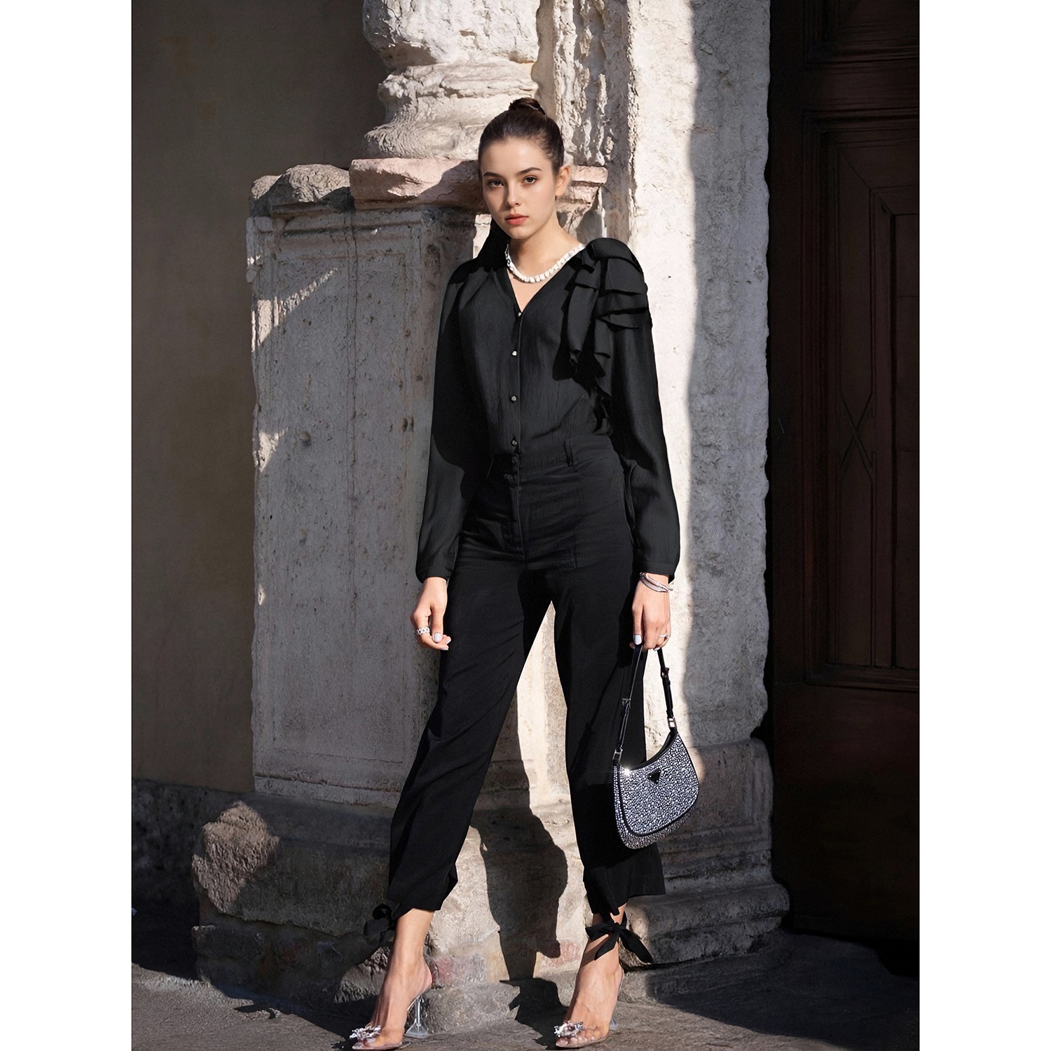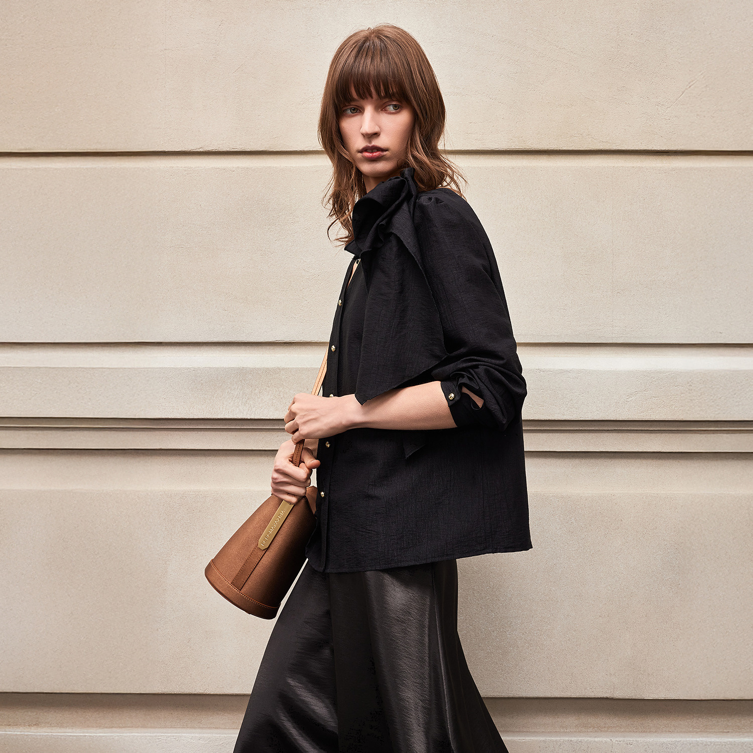BCBG新款 时髦精致简约宽松流行高级感立体花肩部打褶V领女衬衫