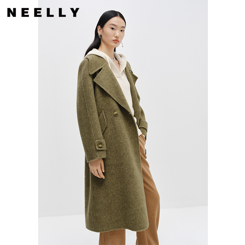 NEELLY纳俪商场同款 收腰系带气质毛呢外套百搭 双面呢大衣女中长款