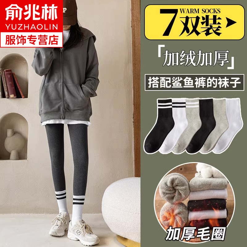 纯棉加绒加厚长筒毛圈毛巾袜冬天 白色袜子女中筒秋冬季 鲨鱼裤 配