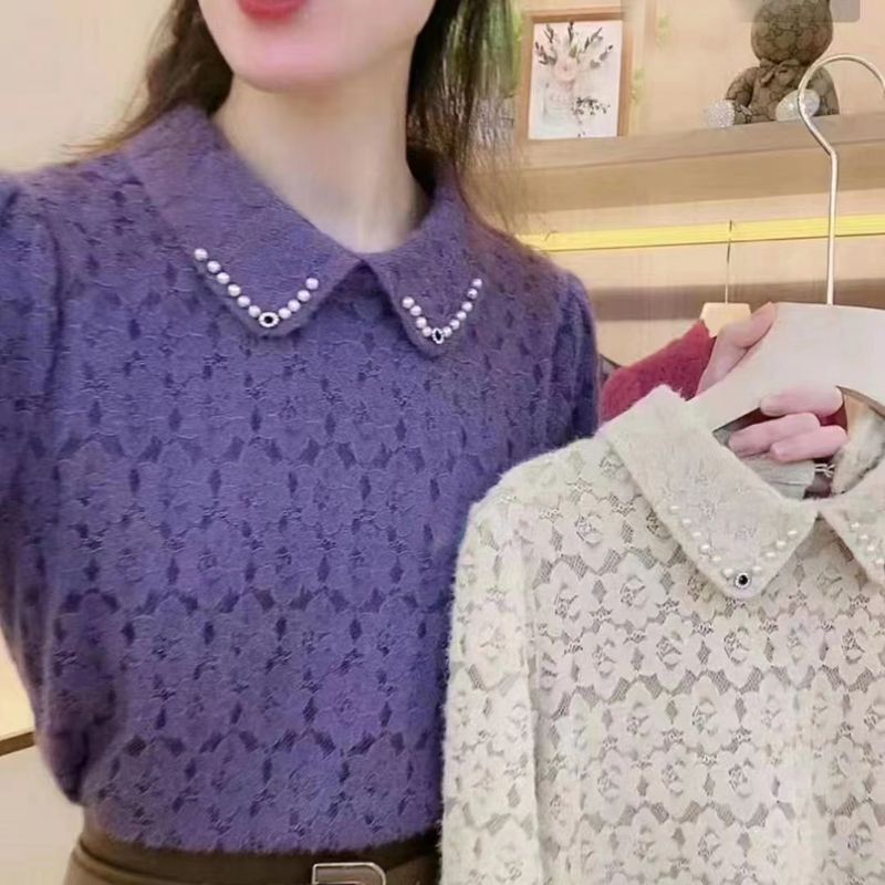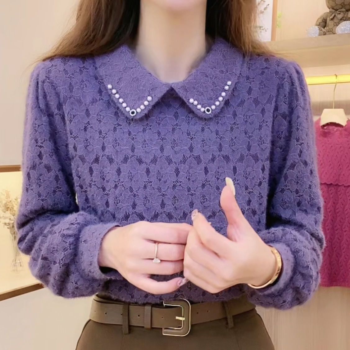 娃娃领显瘦遮肚休闲蕾丝衫 加绒加厚秋冬新款 打底衫 女百搭长袖 衬衫