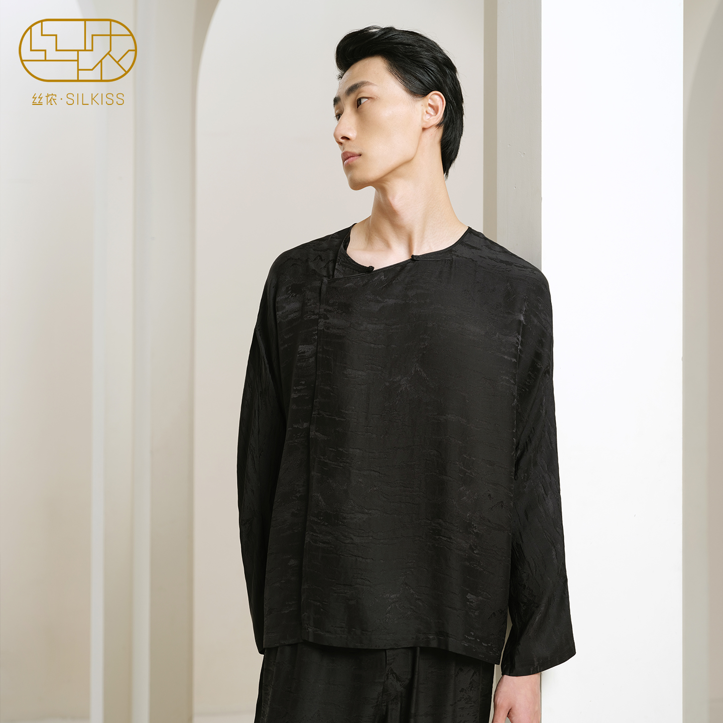 提花真丝睡衣男上衣丝绸盘扣套头桑蚕丝家居服长袖 木槿 丝侬中式