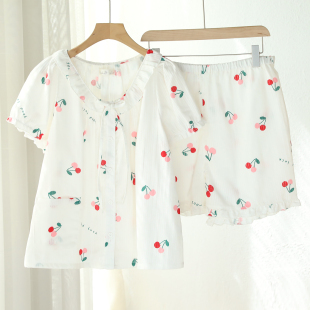 三件套带胸垫可外穿春秋薄家居服套装 短裤 短袖 猫人睡衣女纯棉夏季