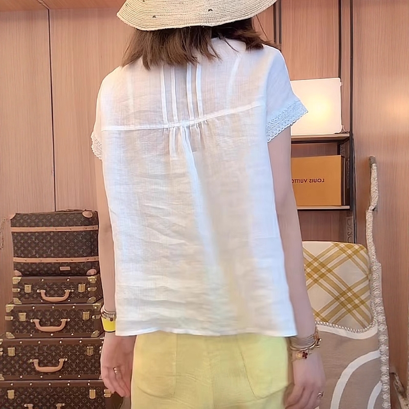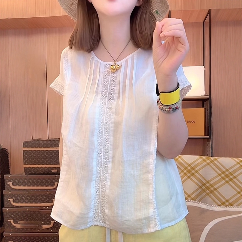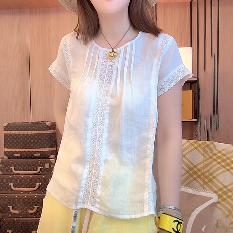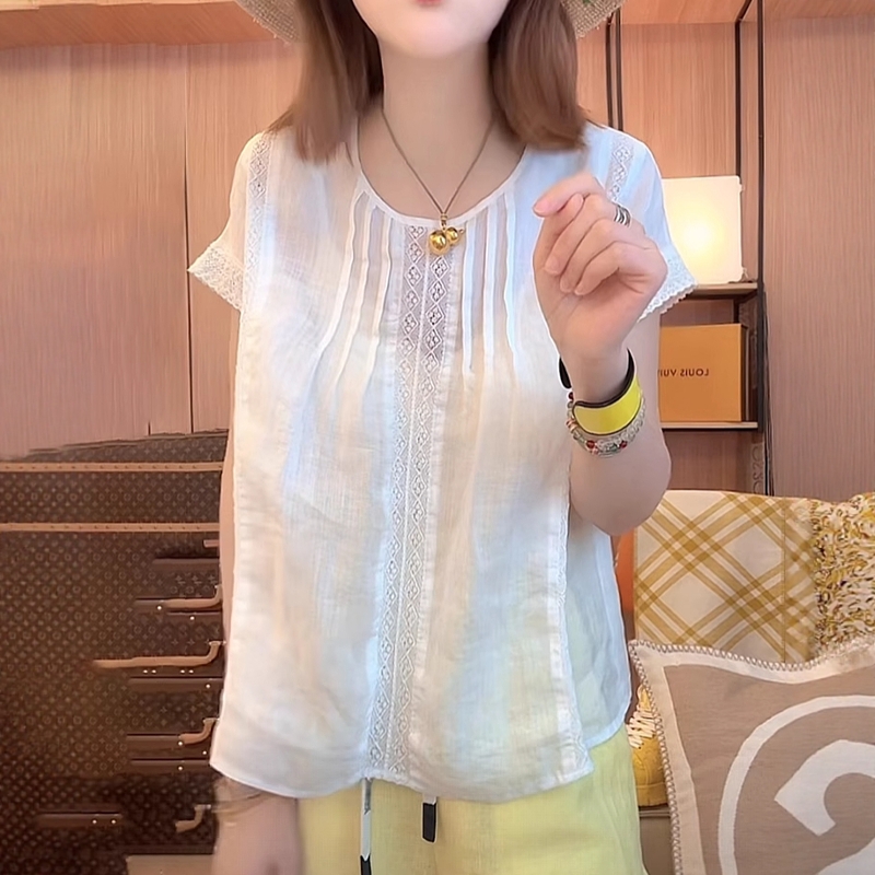 大码 法式 女夏季 衬衫 胖mm遮肚显瘦欧货上衣 高级感白色蕾丝褶皱短袖