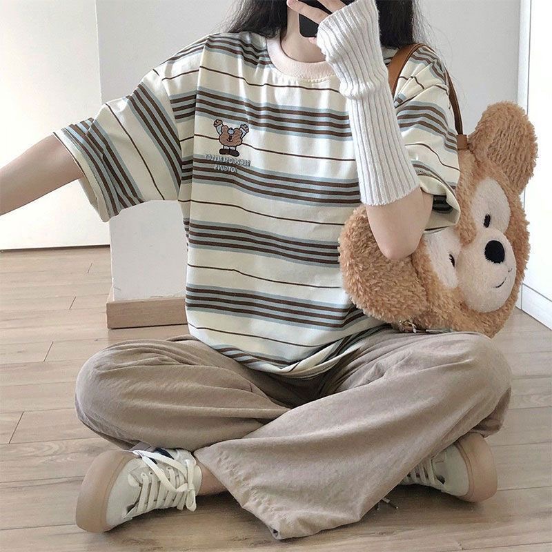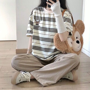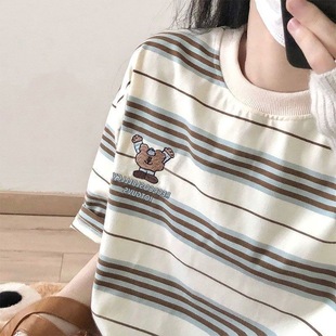 2025春夏新款 T恤宽松设计感小众上衣女 举手小熊刺绣条纹圆领短袖
