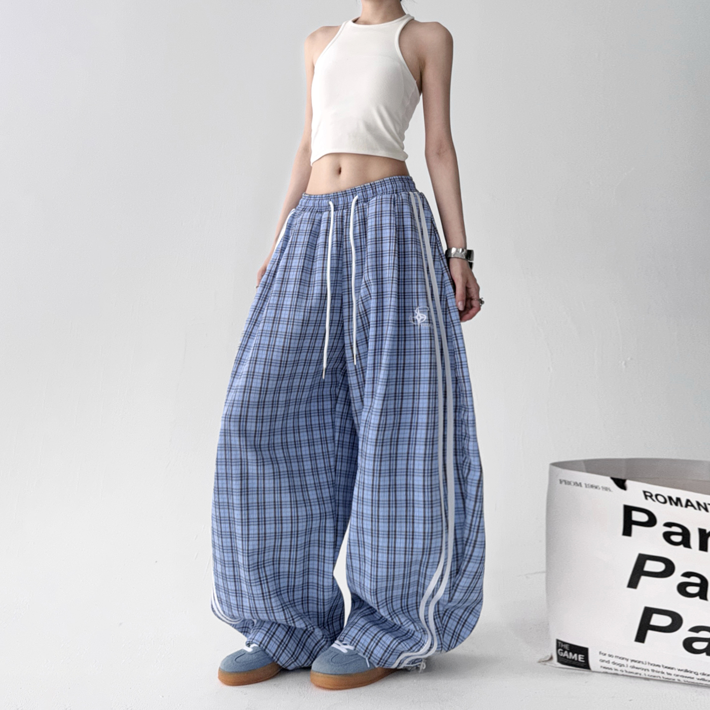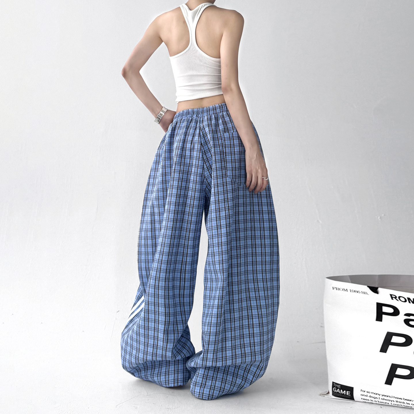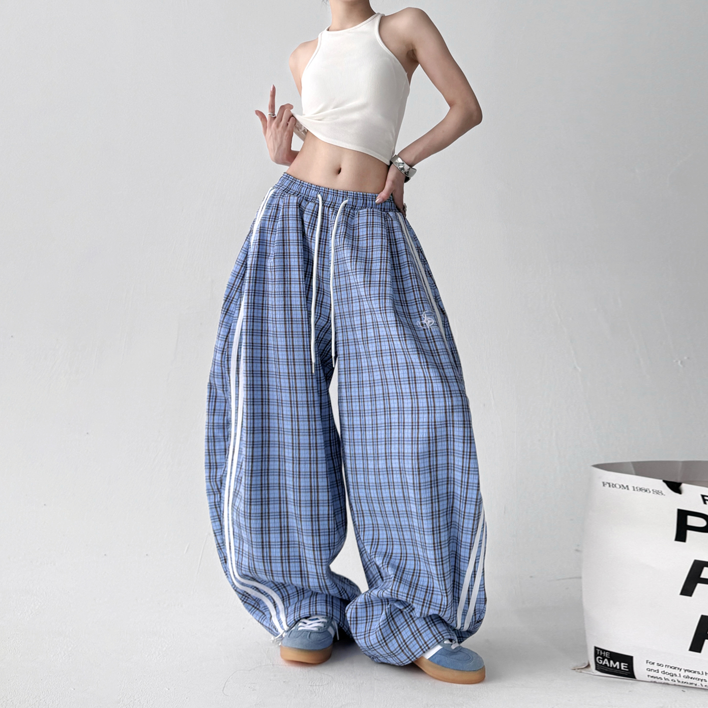 设计感拼接阔腿宽松休闲裤 美式 薄款 女2025夏季 高街潮牌蓝色格子裤