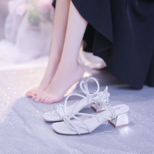 高跟鞋 一字带粗跟水钻仙女凉鞋 拖鞋 外穿2023新款 中跟配裙子 女时尚