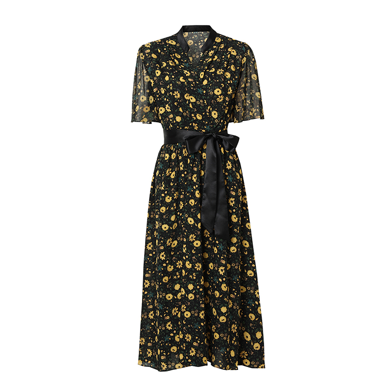连衣裙夏女2025年新款 高级时尚 短袖 中长款 裙子 碎花v领女装 海青蓝