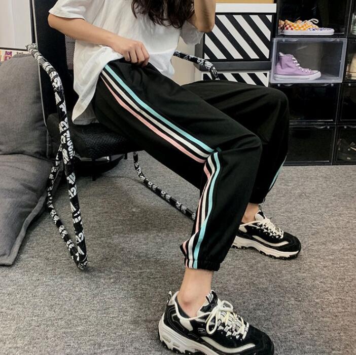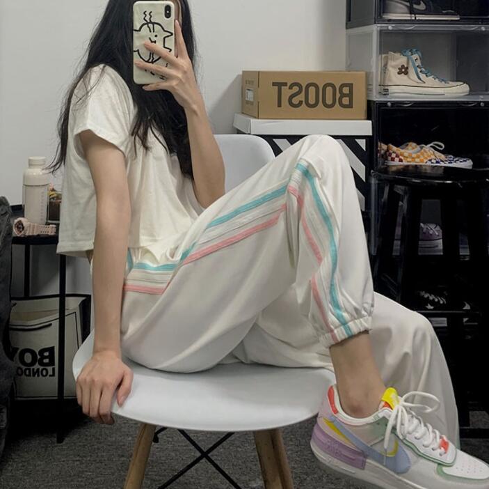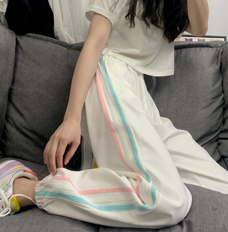 百搭阔腿九分裤 撞色条纹直筒哈伦裤 宽松显瘦高腰韩版 新款 潮 女春季