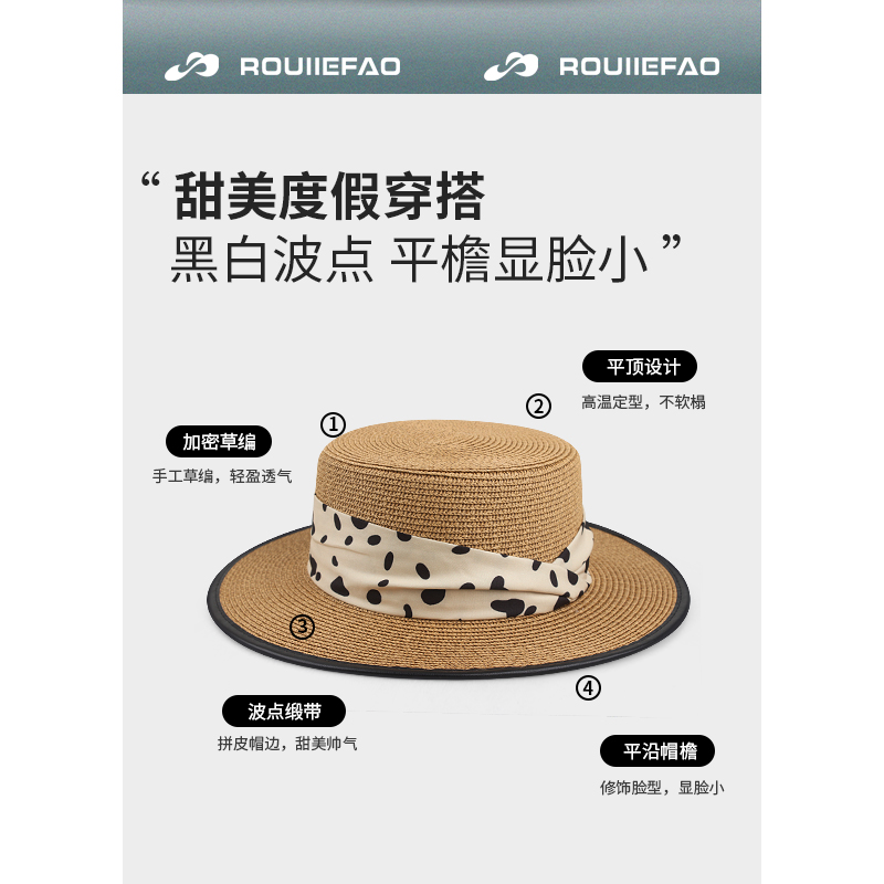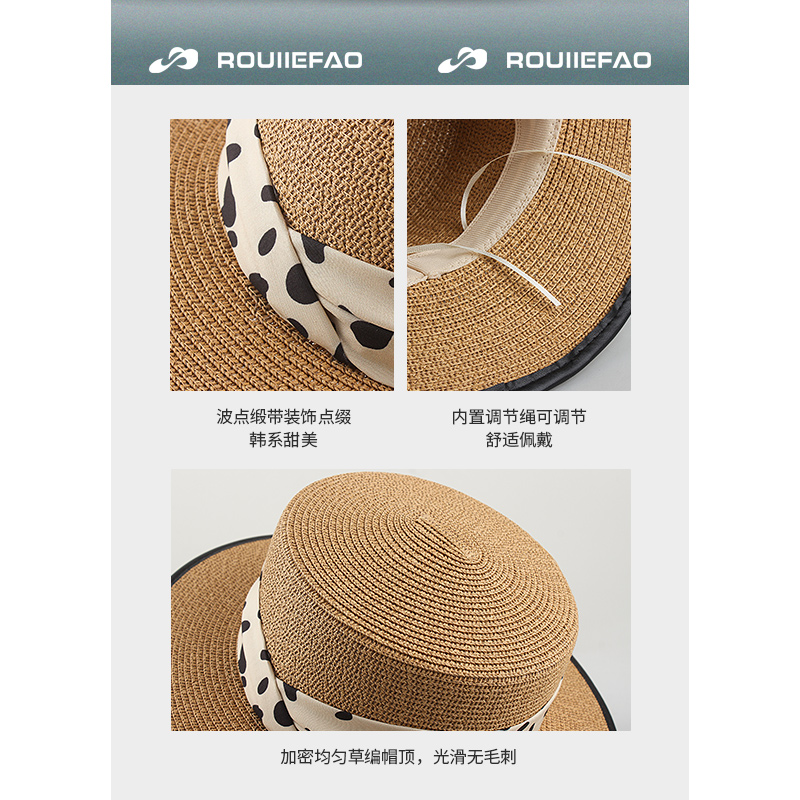 法式 海边沙滩度假防晒遮阳帽小礼帽子 浪漫波点织带平顶草帽女夏季