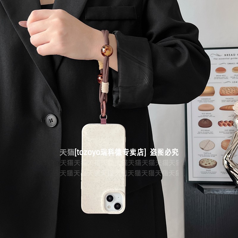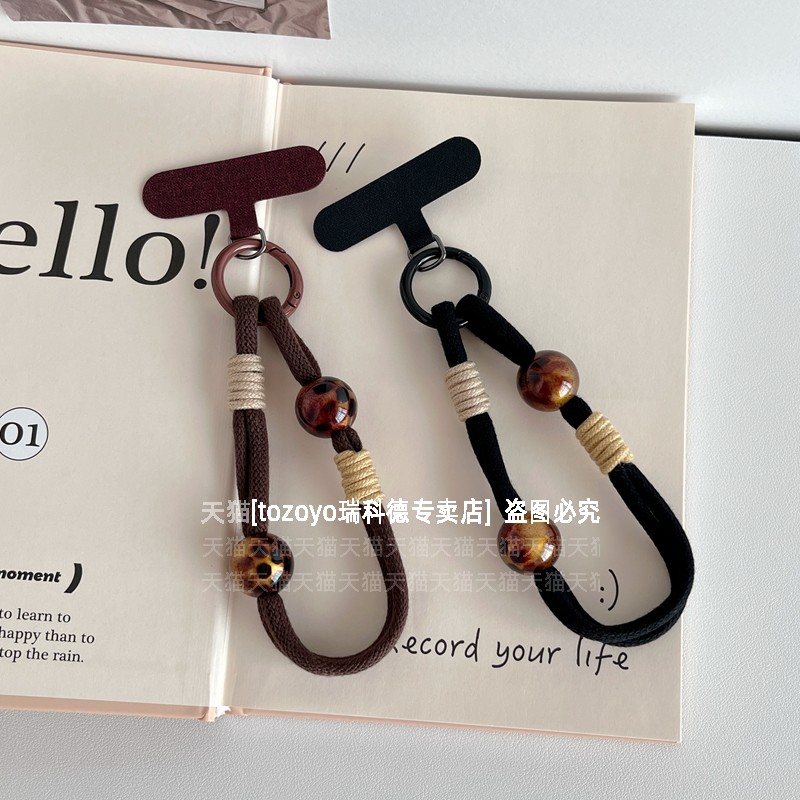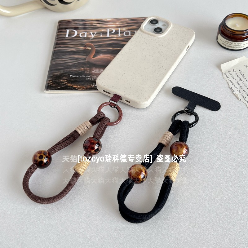 秋冬美拉德手机挂绳新款 高级短手绳棉绳腕带复古链吊绳网红女挂饰配件黑棕色带夹片壳 豹纹串珠手腕绳挂件时尚