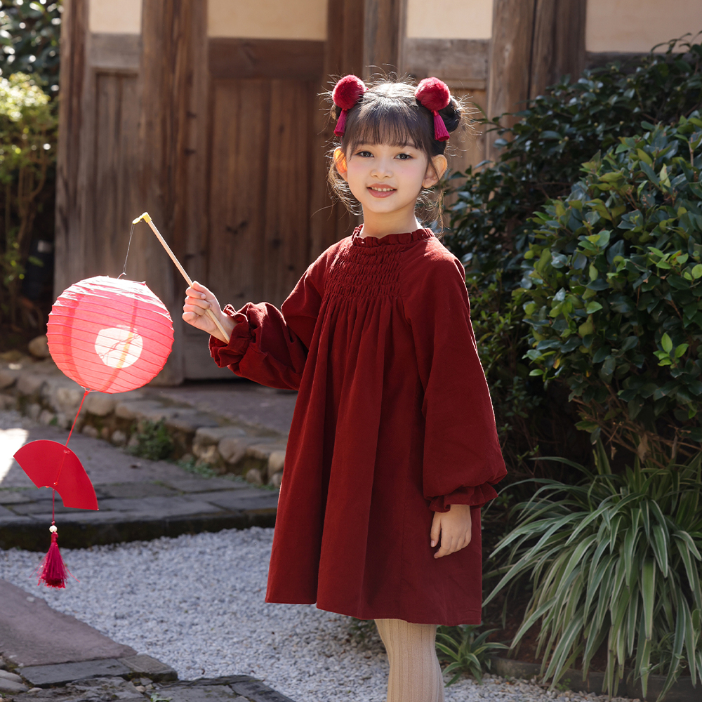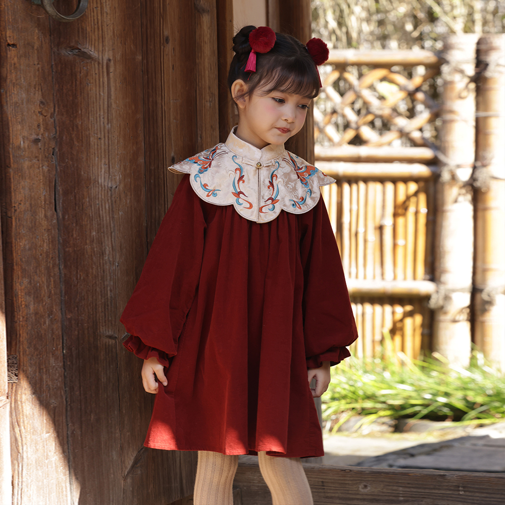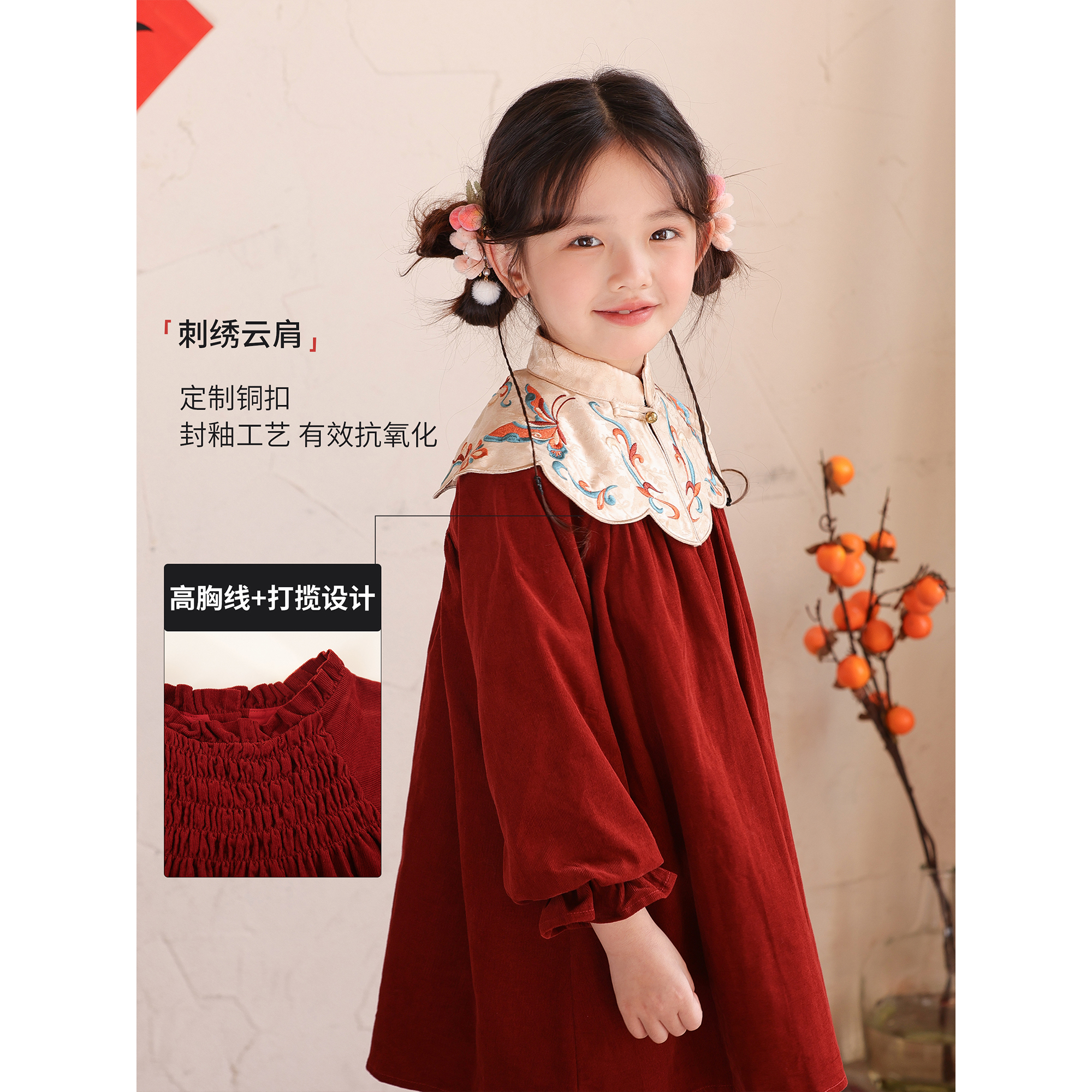 年服裙 国风复古红灯芯绒连衣裙 高端女童 重工刺绣云肩 初煦