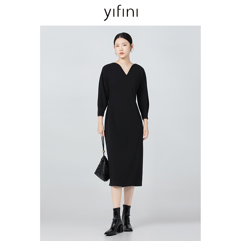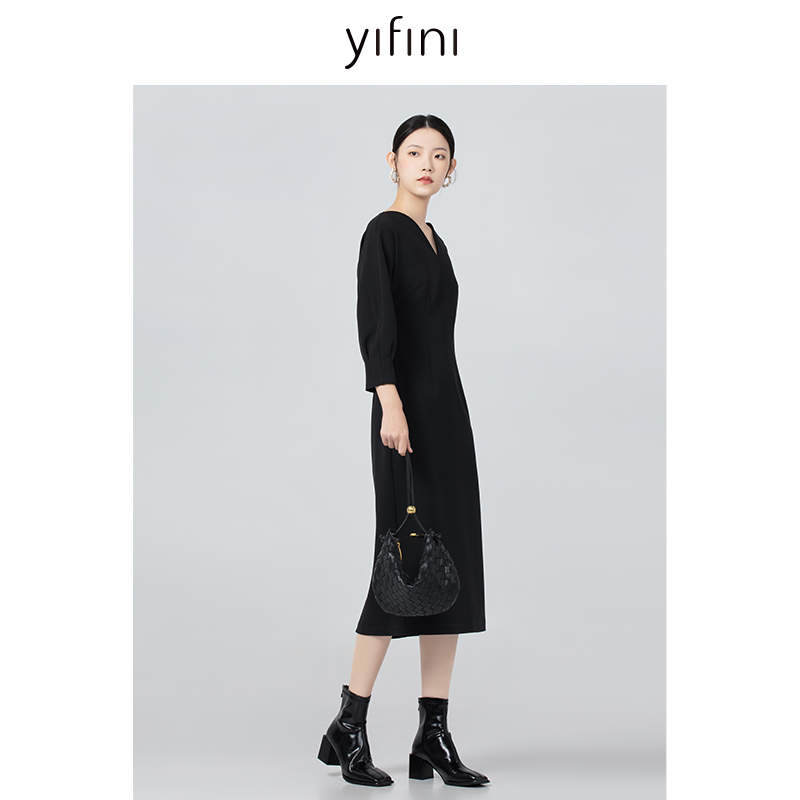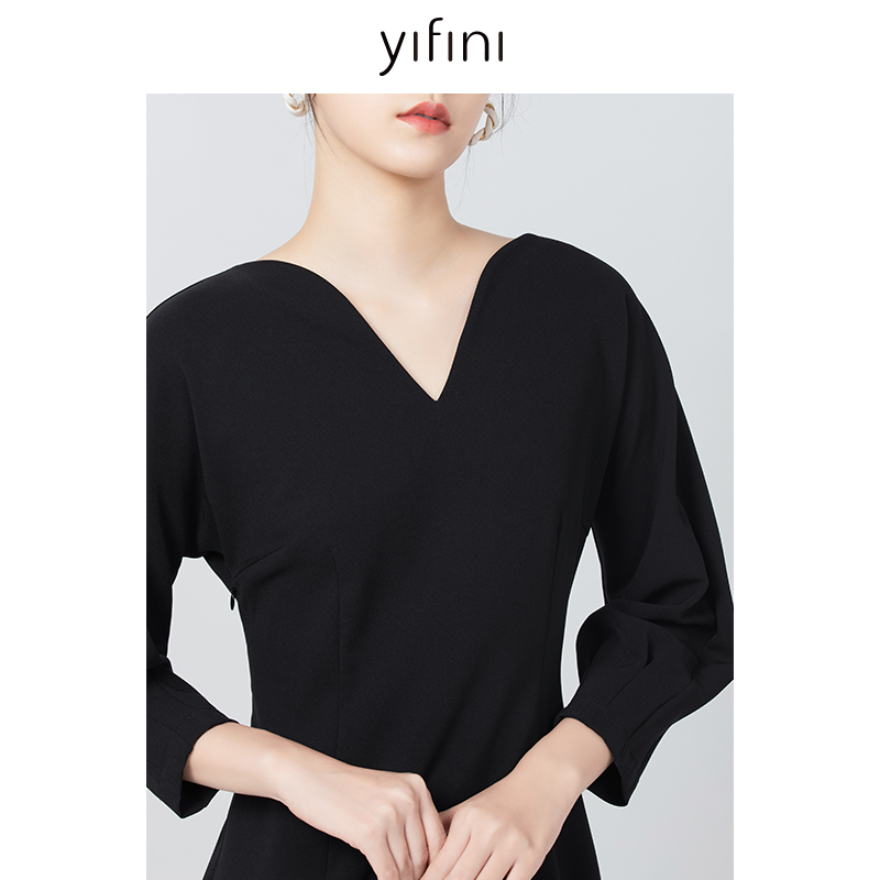 中长款 Yifini 黑色连衣裙女春秋新款 V领长袖 裙子 易菲合体修身