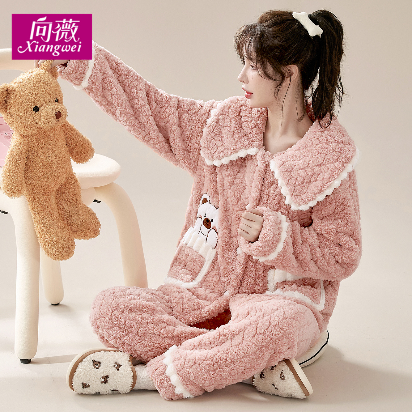 暖绒甜美可爱学生家居服可外穿加绒加厚法兰绒睡衣女宽松珊瑚绒