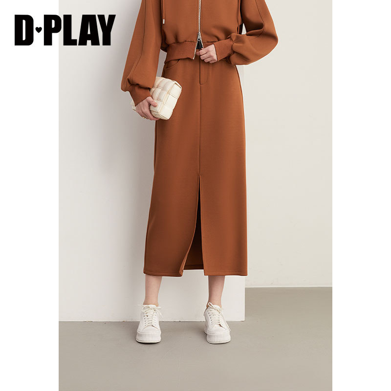 DPLAY新美拉德慵懒休闲套装 焦糖色撞色前开衩舒适直筒半身裙