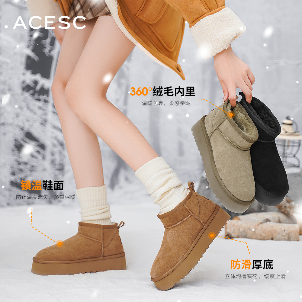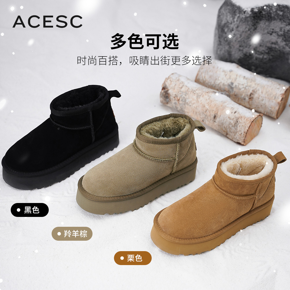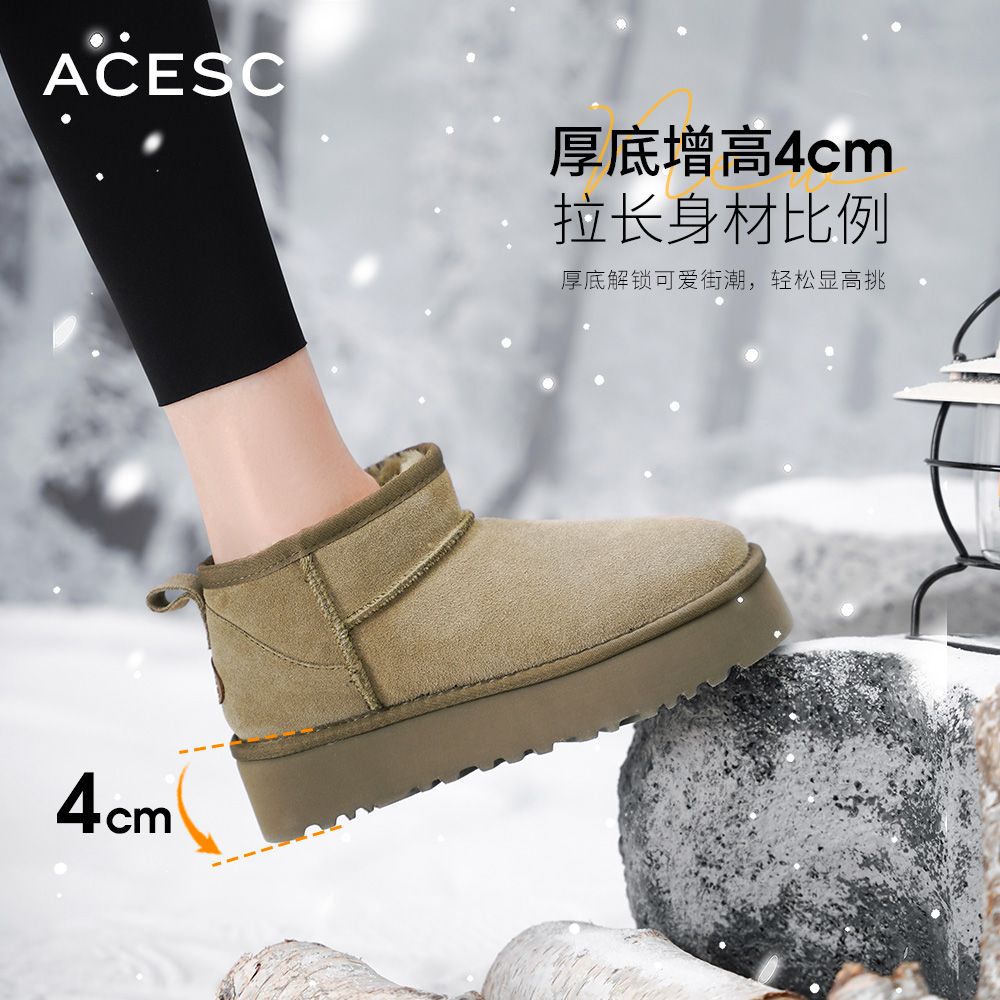 艾斯臣真皮雪地靴女新款 冬短筒厚底轻便增高短靴加厚加绒保暖棉鞋
