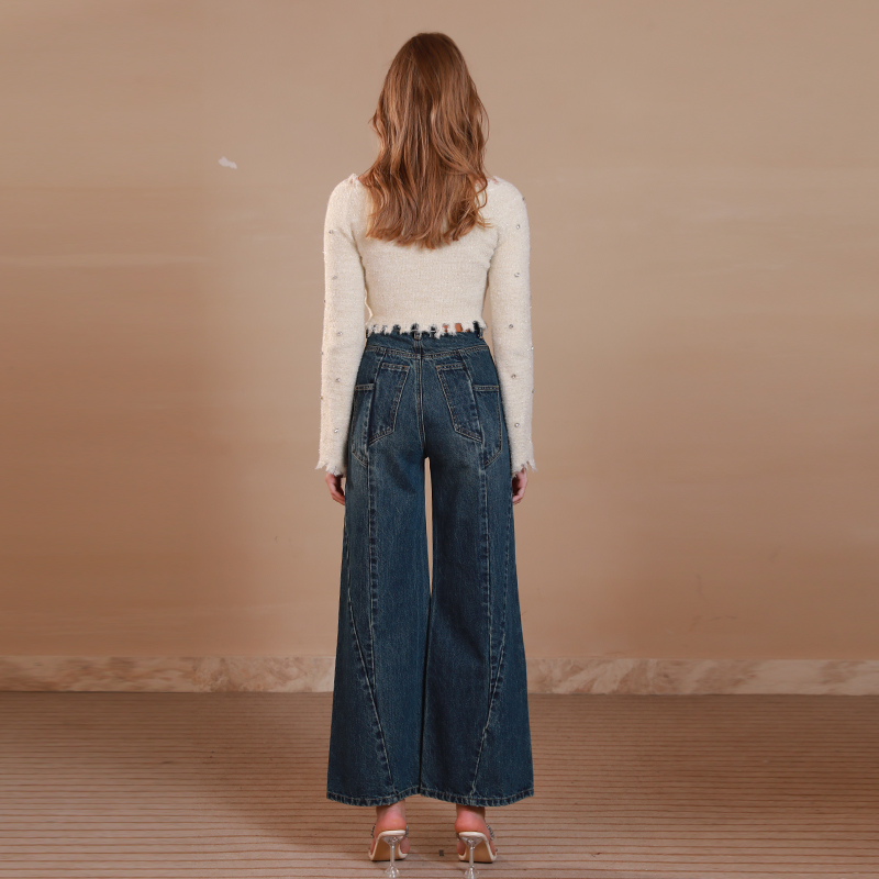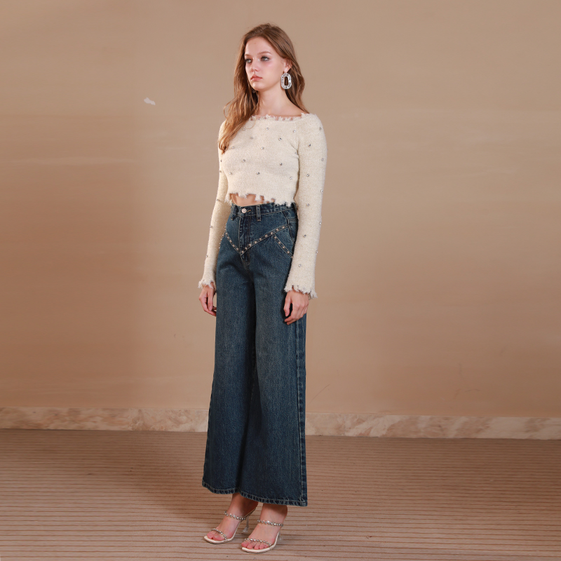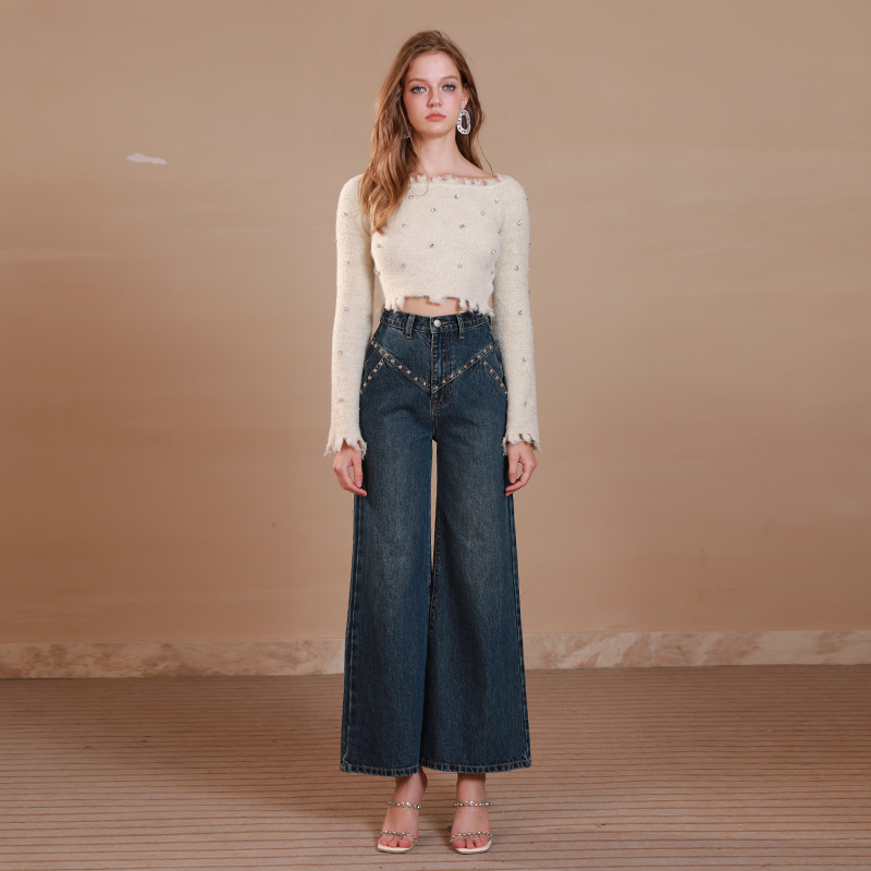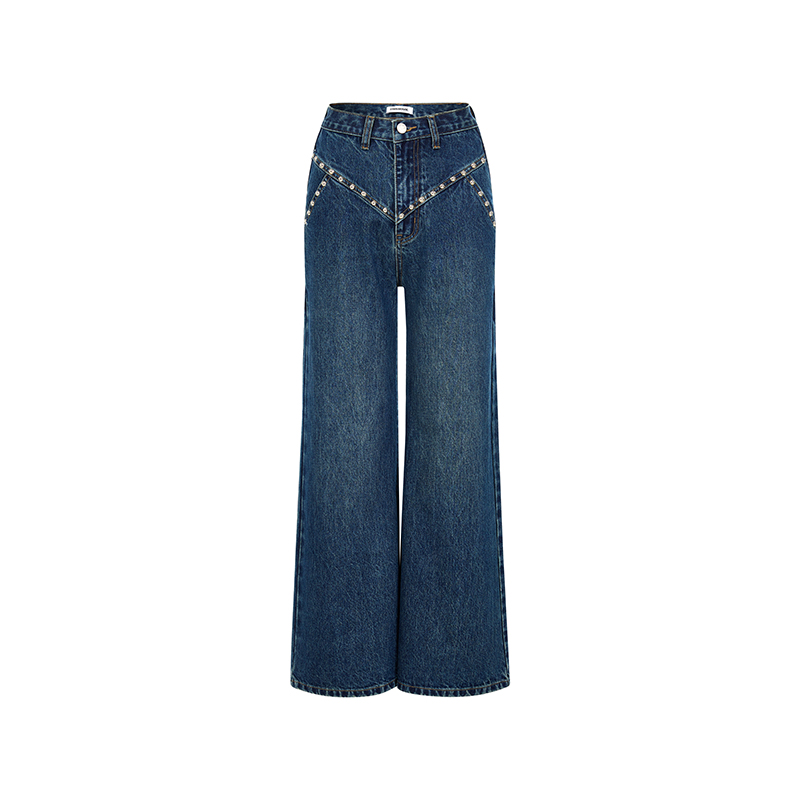 秋冬新款 EIMISMOSOL普鲁士蓝铆钉阔腿牛仔裤 时尚 刘雅瑟同款