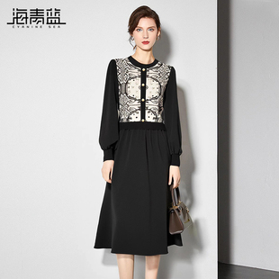 惠品 蓝色连衣裙女修身 2025年秋季 方领法式 针织裙子 新款 DPLAY