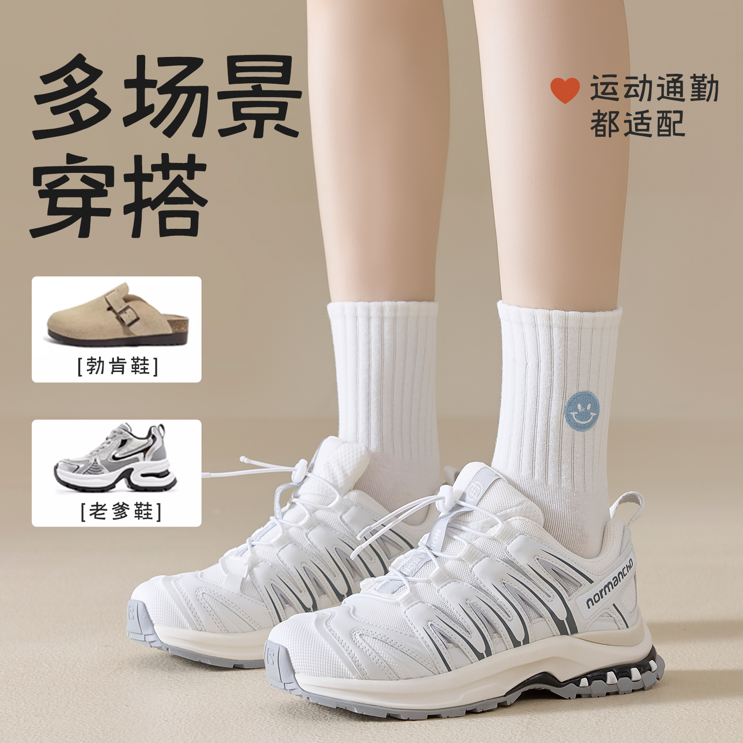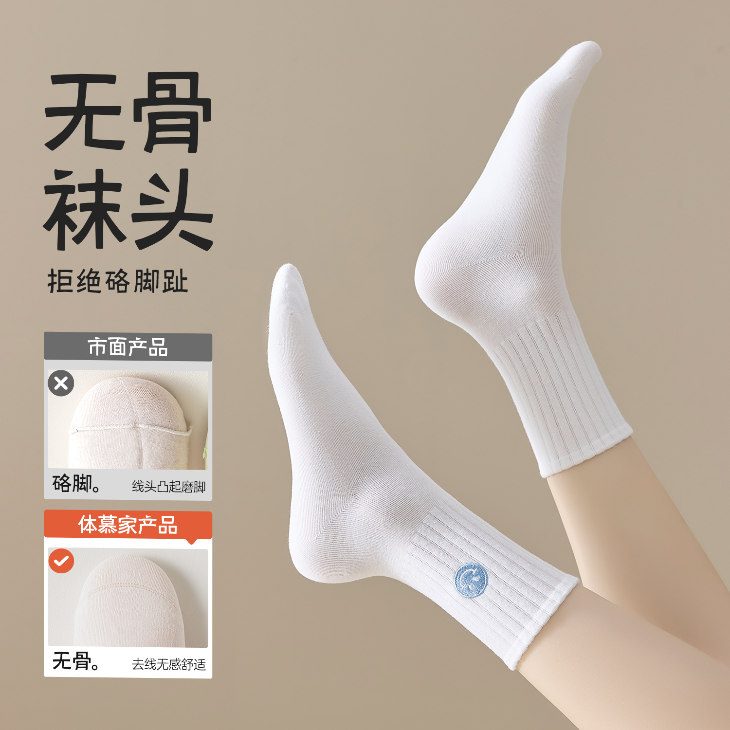 白色袜子女春秋纯棉纱线2024新款 中筒袜无骨刺绣吸汗运动长袜 爆款