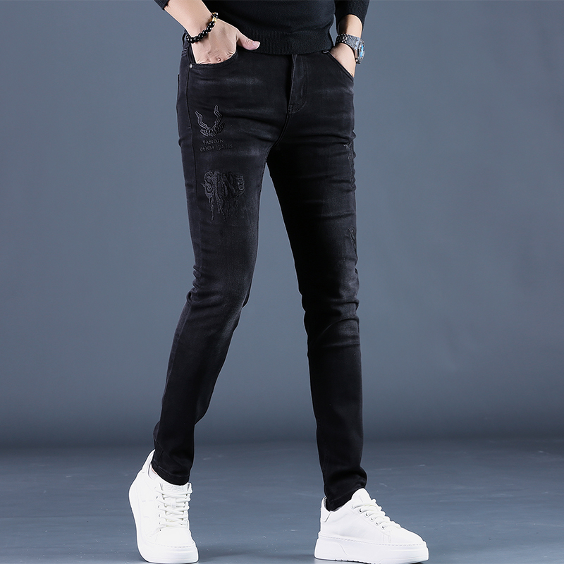 新款 小脚百搭弹力高端休闲长裤 黑色刺绣牛仔裤 修身 潮 男士 2025秋季