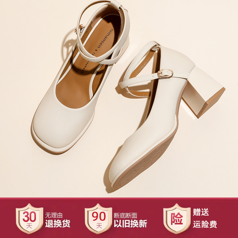 配裙子软底休闲单鞋 粗跟法式 女2025春秋新款 真皮玛丽珍绑带高跟鞋