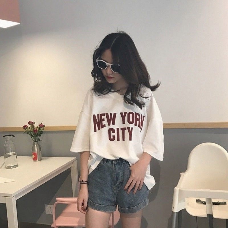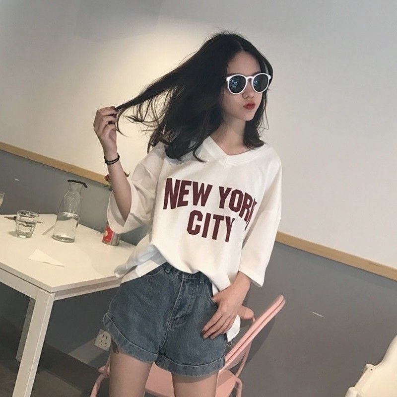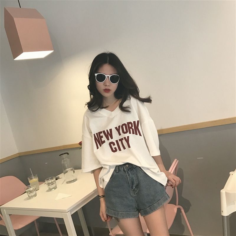 v领遮肚子上衣大码 白色t恤纯棉宽松半袖 胖mm显瘦潮 女夏季 字母短袖