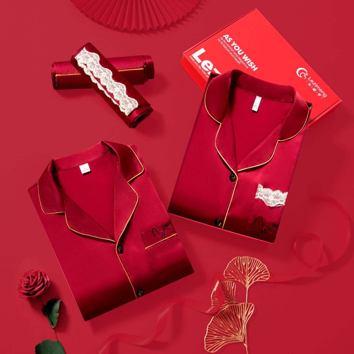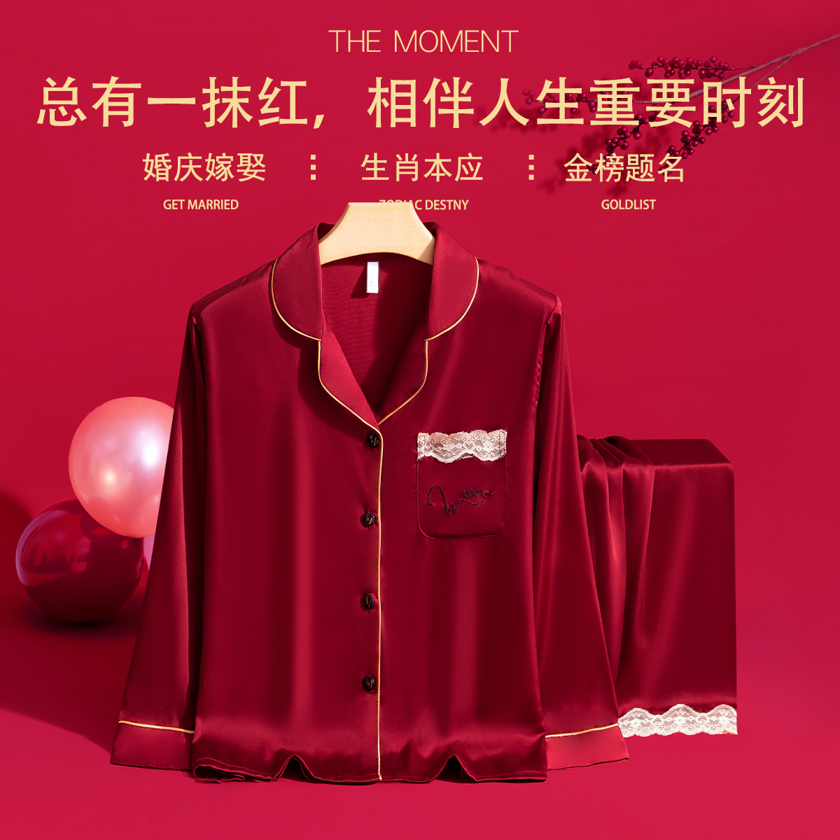 乐姿梦红色结婚睡衣新婚情侣套装 冰丝新娘陪嫁本命年红 女春秋夏季