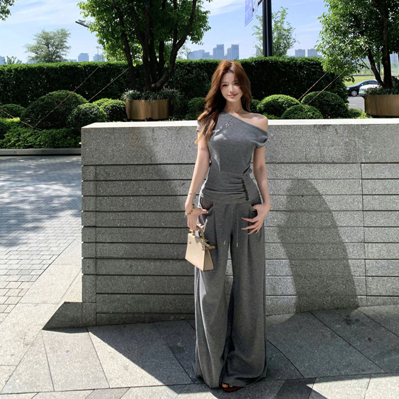新款 长裤 复古性感慵懒风斜肩短袖 高腰直筒休闲裤 收腰T恤上衣 夏季