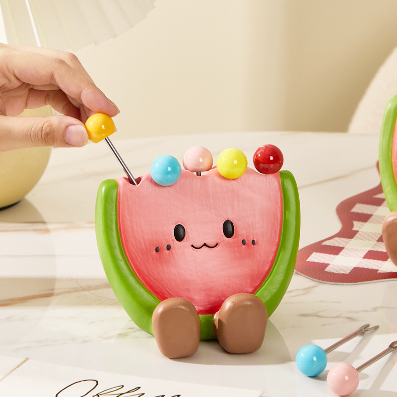夏日西瓜水果叉家用不锈钢轻奢高级感收纳罐套装 儿童安全叉子果签
