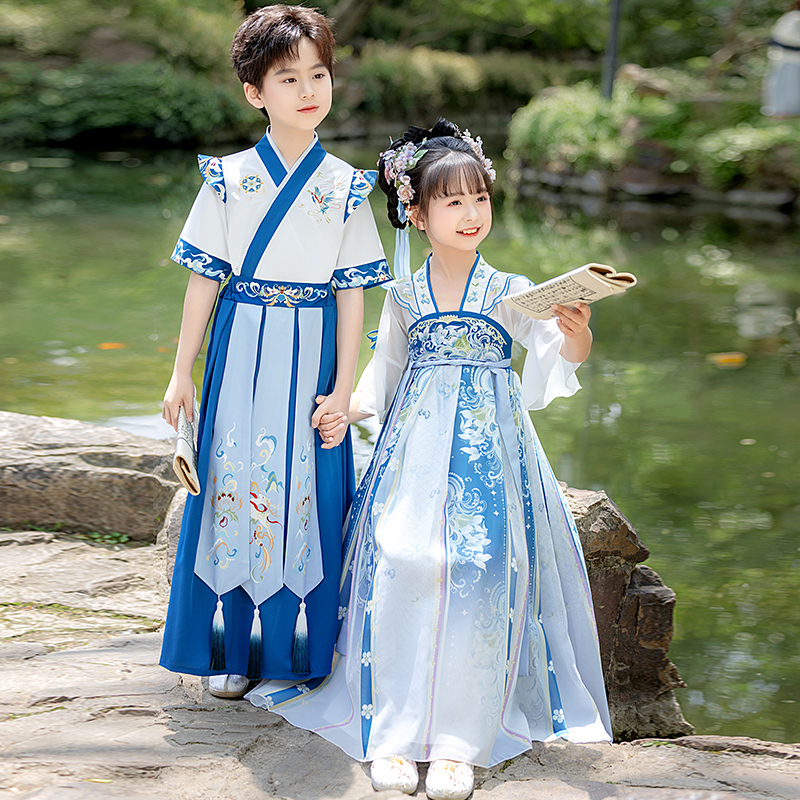 短袖 古风男孩女童古装 国学演出服 儿童中国风夏季 汉服男童2025新款