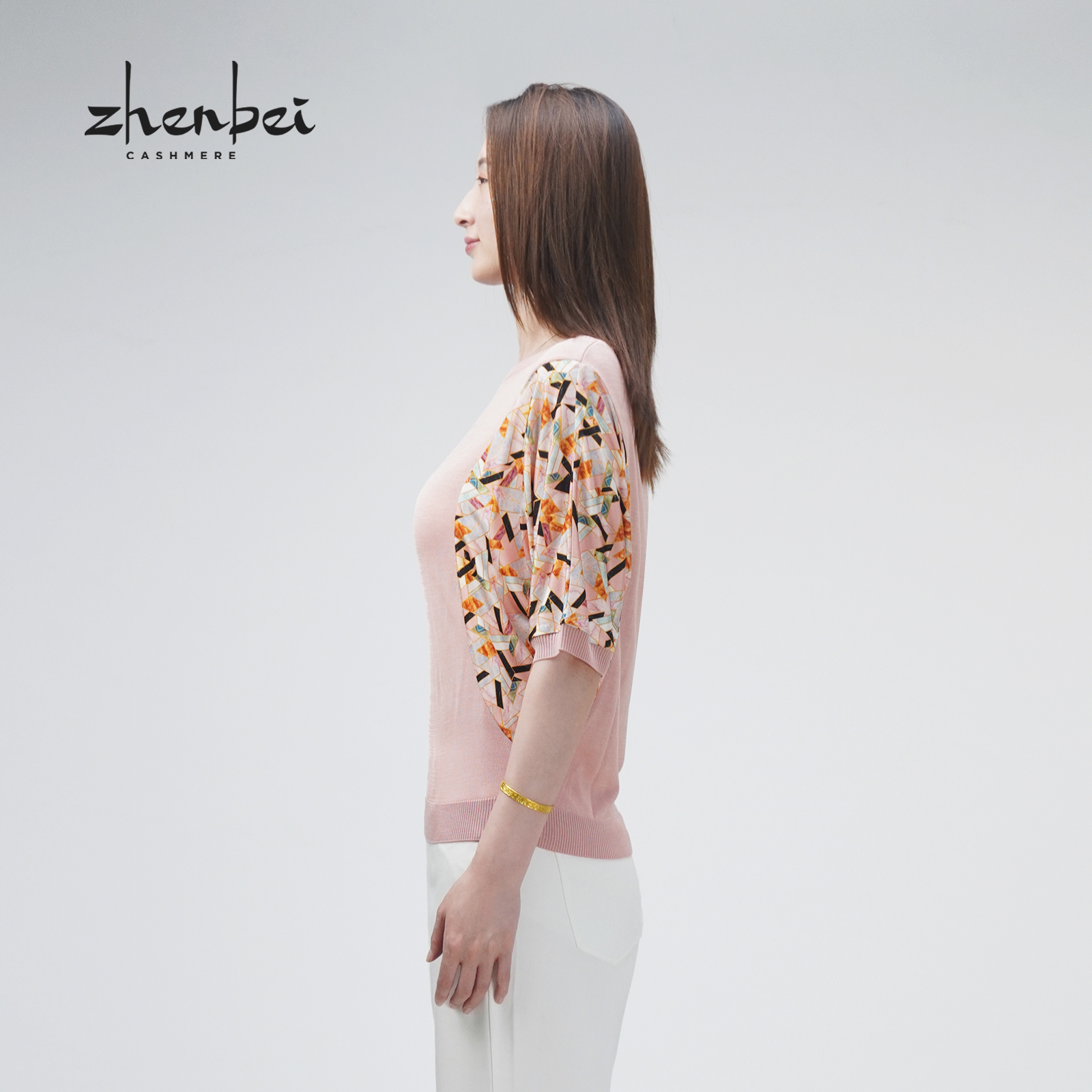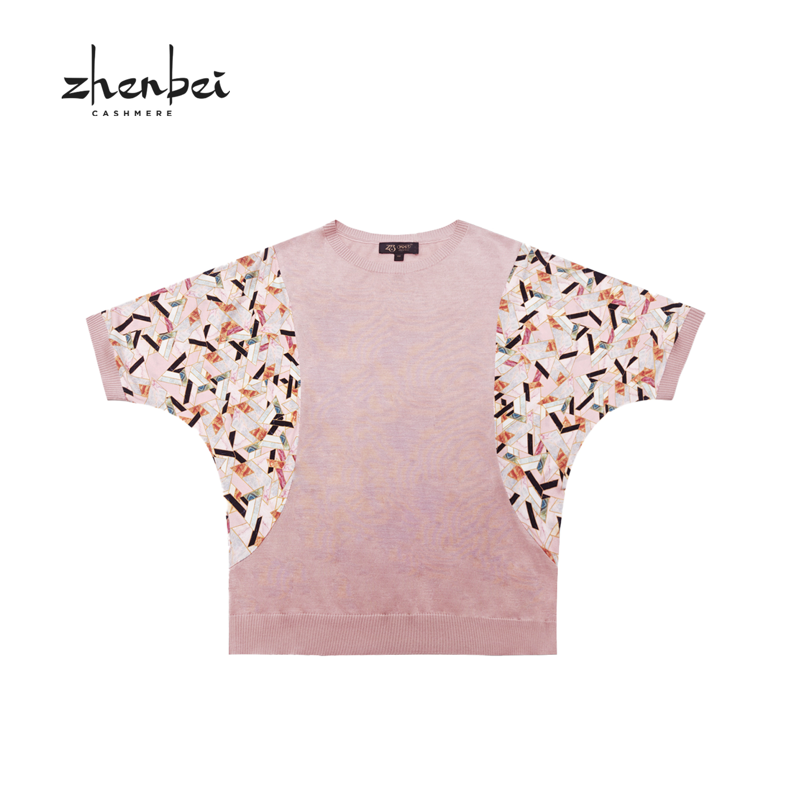 女衫 圆领粉调印花相拼蝙蝠袖 桑蚕丝短袖 77548 珍贝2025春夏新款