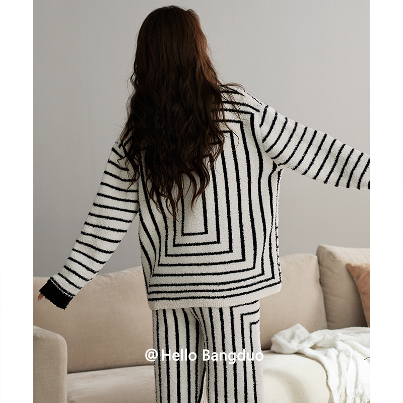 睡衣女冬季 法兰绒条纹家居服 珊瑚绒加厚加绒秋冬半边绒可外穿冬款