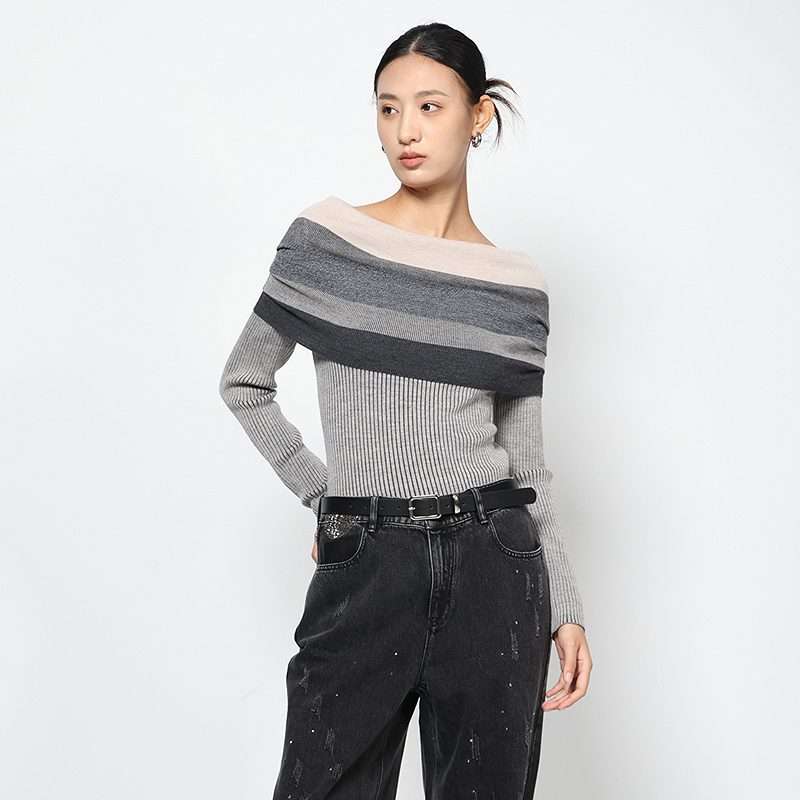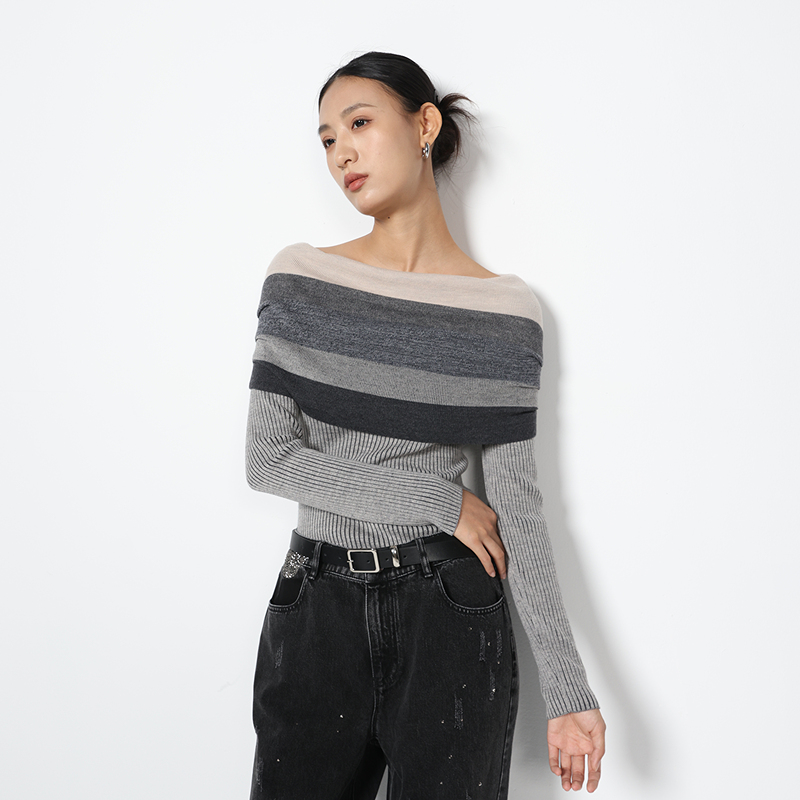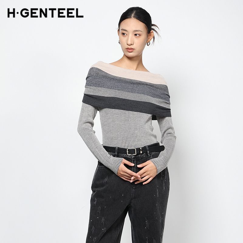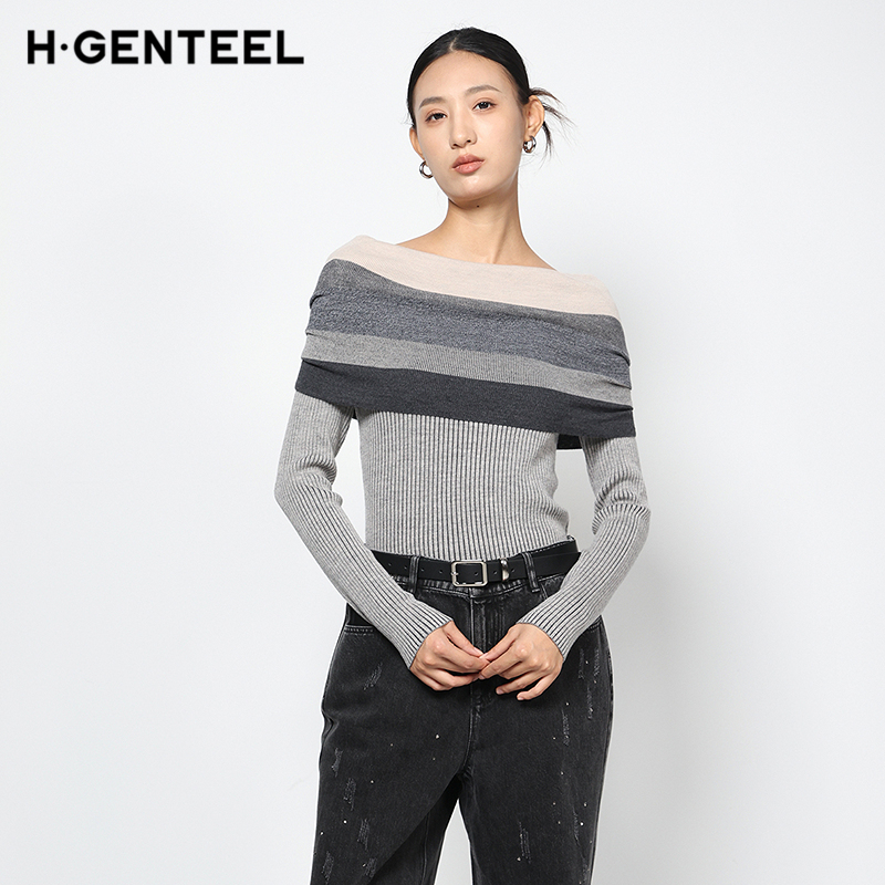 毛针织衫 女渐变条纹一字肩纯羊毛长袖 女 冬装 H·GENTEEL荷高新款