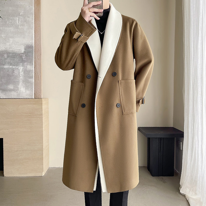 过膝加厚外套冬季 重磅老钱风双面羊毛呢子大衣男长款 风衣 储格