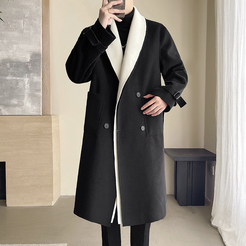 韩版 长款 呢子加厚风衣外套 2025春秋季 V37黑色高级感毛呢大衣男款