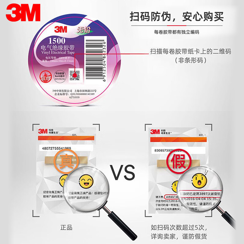 3M1500电工胶布3M1600电气绝缘胶带防水环保无铅阻燃黑胶布PVC电胶布电气工电线绝缘胶黑红白蓝绿黄