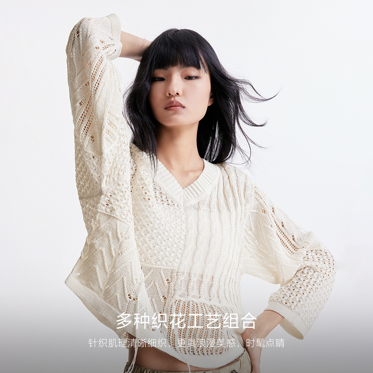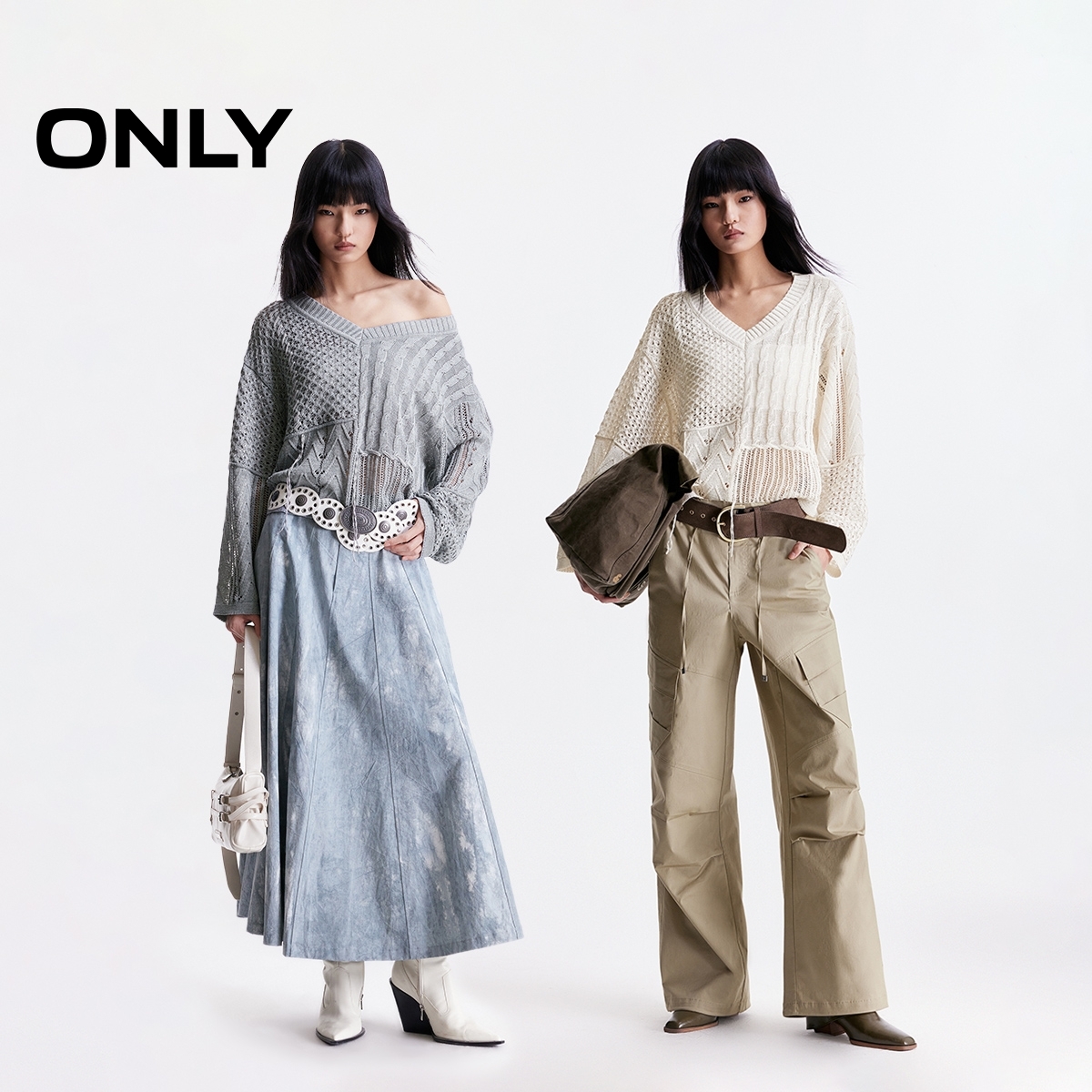 针织衫 宽松不对称钩花编织肌理V领落肩长袖 女 新款 ONLY2025冬季