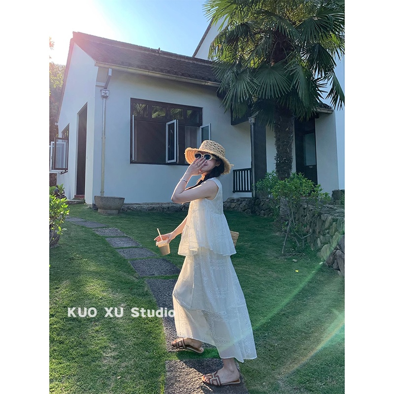 夏日独特漂亮套装 上衣背心休闲半身裙中长裙女 裙气质圆领镂空无袖
