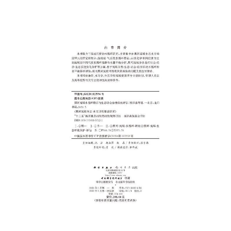 科学出版 肖洪浪等 社 黑河流域水循环特征与生态综合治理成效评估 全新正版