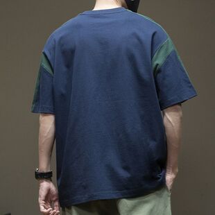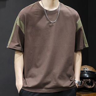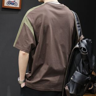 男青年T恤衫 2025新款 T恤男落肩半袖 潮流日系拼接撞色正肩短袖 夏季