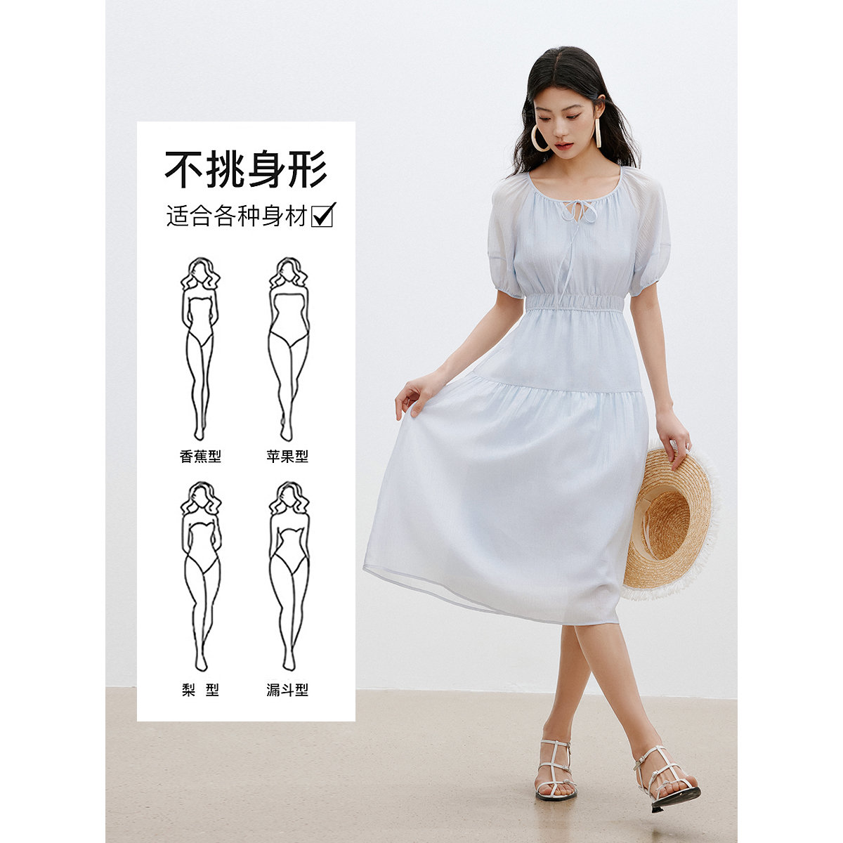 高腰蛋糕裙子 法式 衣香丽影蓝色系带真丝混纺连衣裙女2025夏装 新款