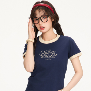 短款 Gbiaior美式 小众设计感撞色修身 t恤女2025夏季 上衣潮 复古短袖