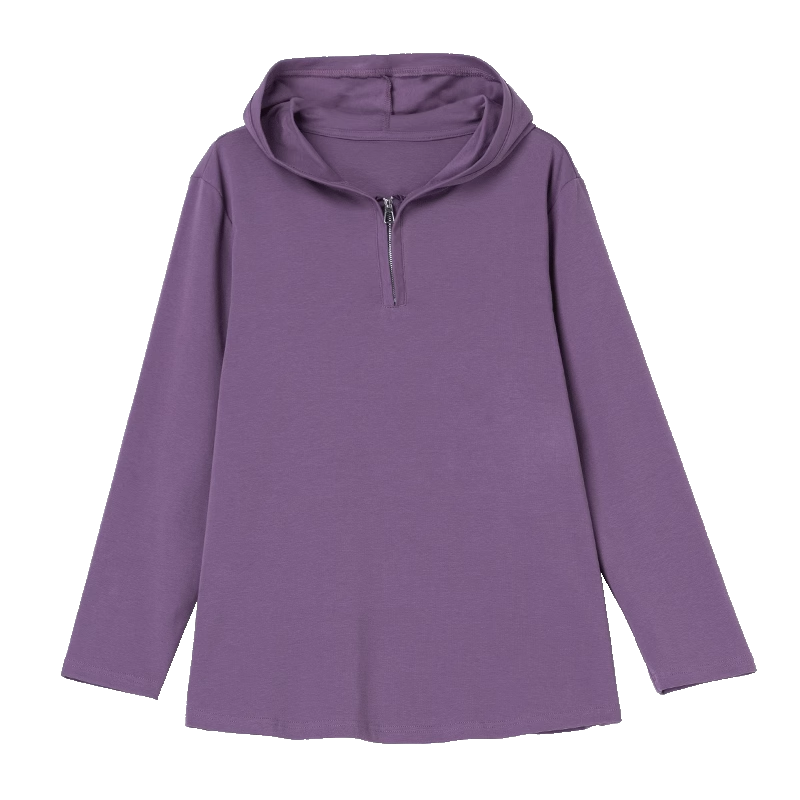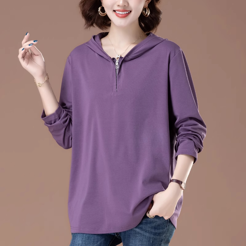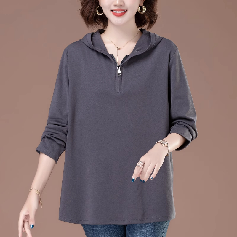 半拉链上衣 中老年妈妈宽松加肥加大码 纯棉长袖 带帽T恤女春秋新款