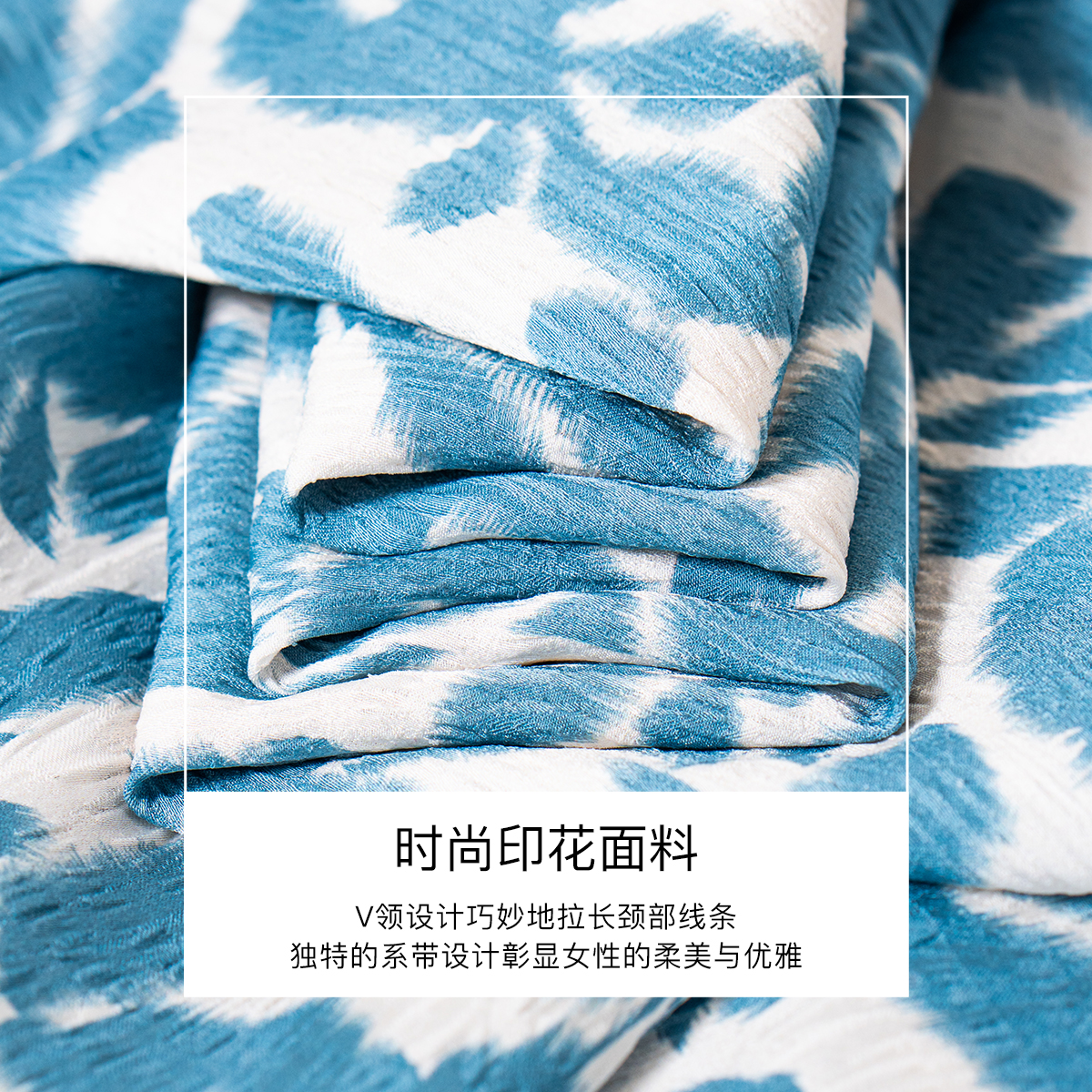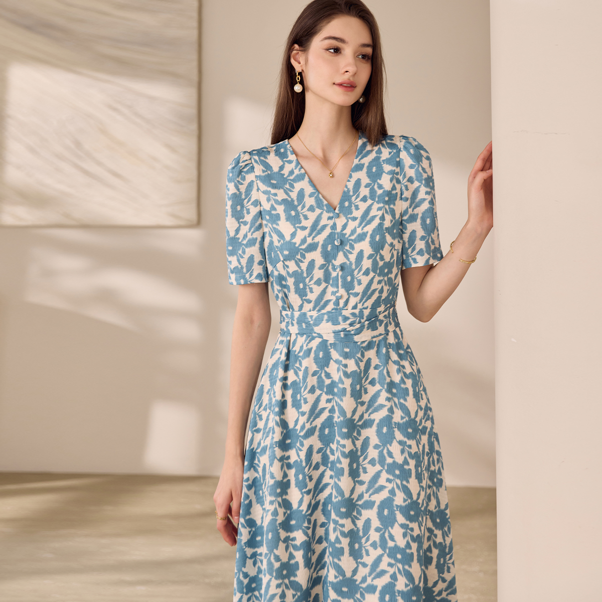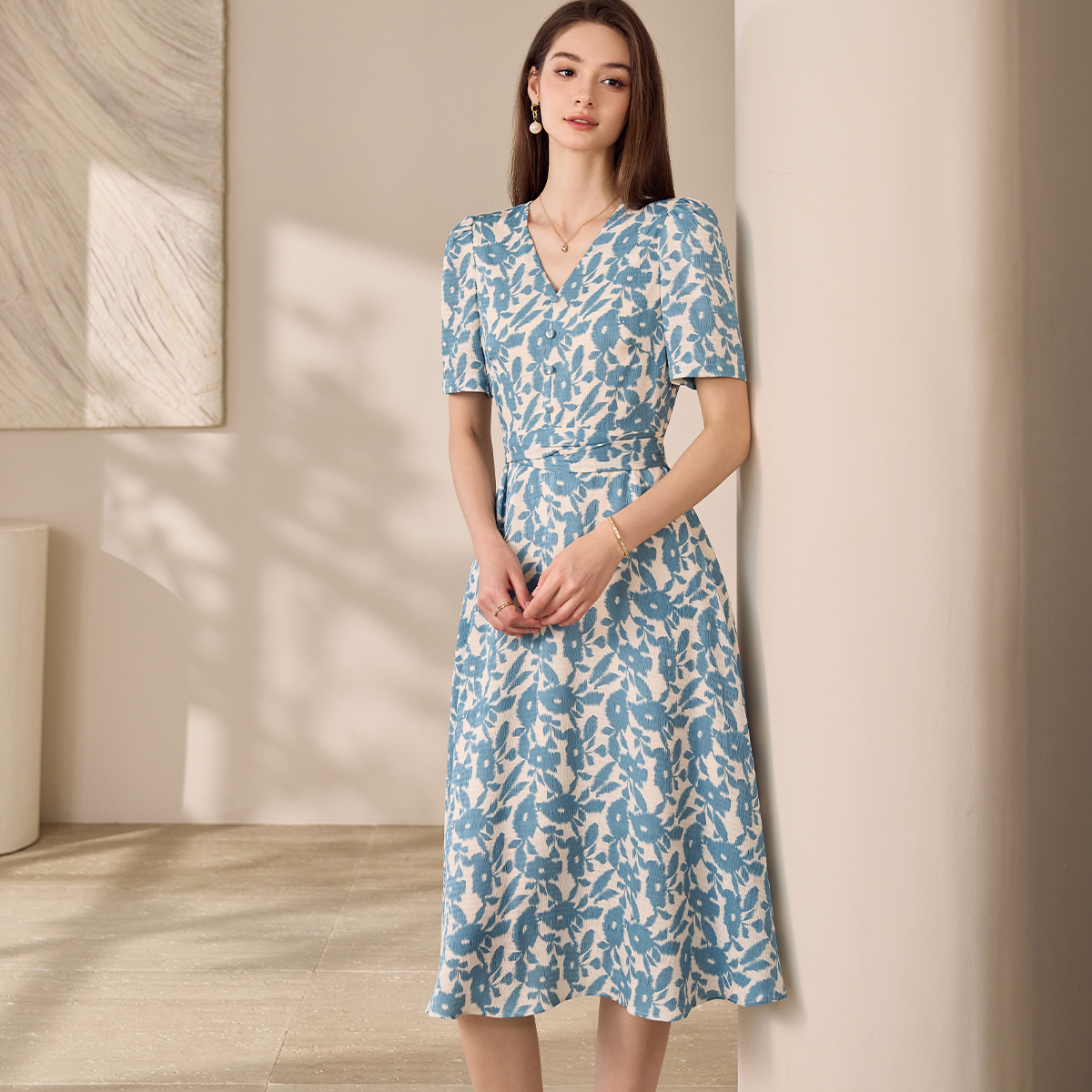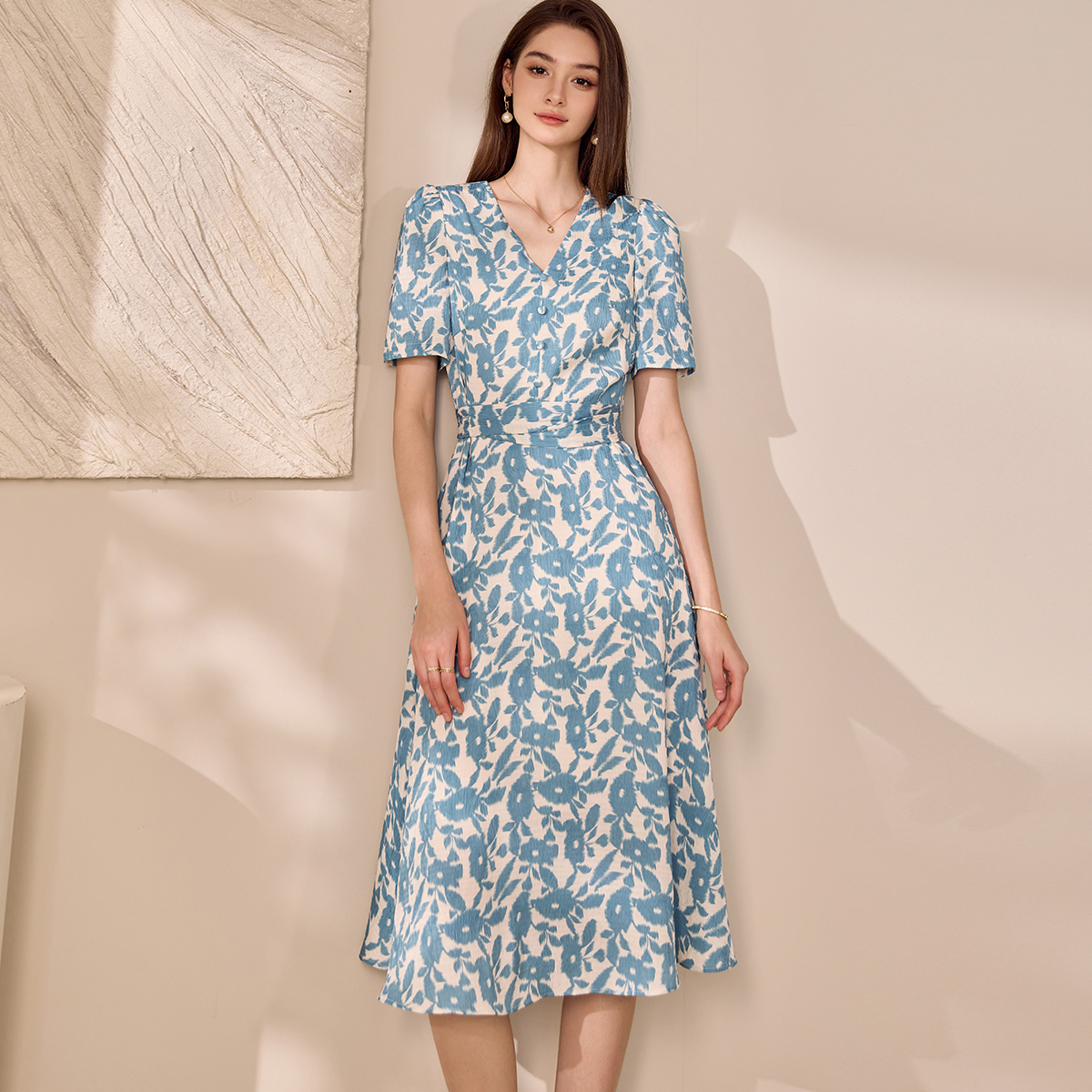 罗衣优雅收腰系带连衣裙2025夏季 气质花色V领大摆中长裙11859 新款