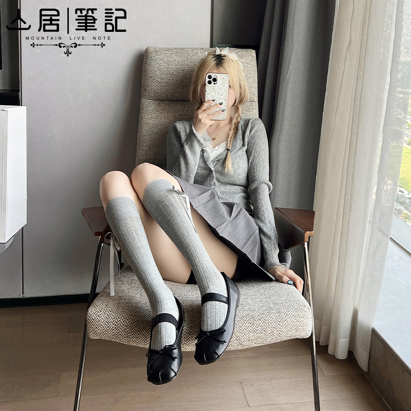 灰色蝴蝶结绑带袜子女款 春秋小腿袜女生JK日系可爱长筒袜配小皮鞋