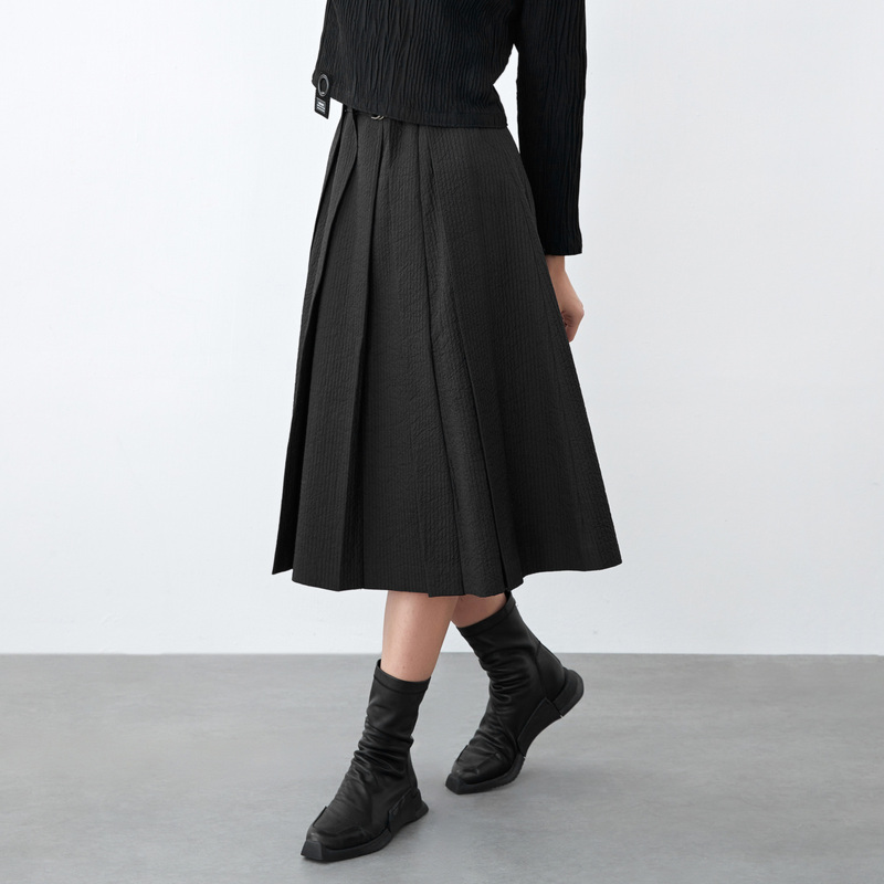 sdeer圣迪奥女装 设计感腰带百褶肌理黑色A字长裙S21481109
