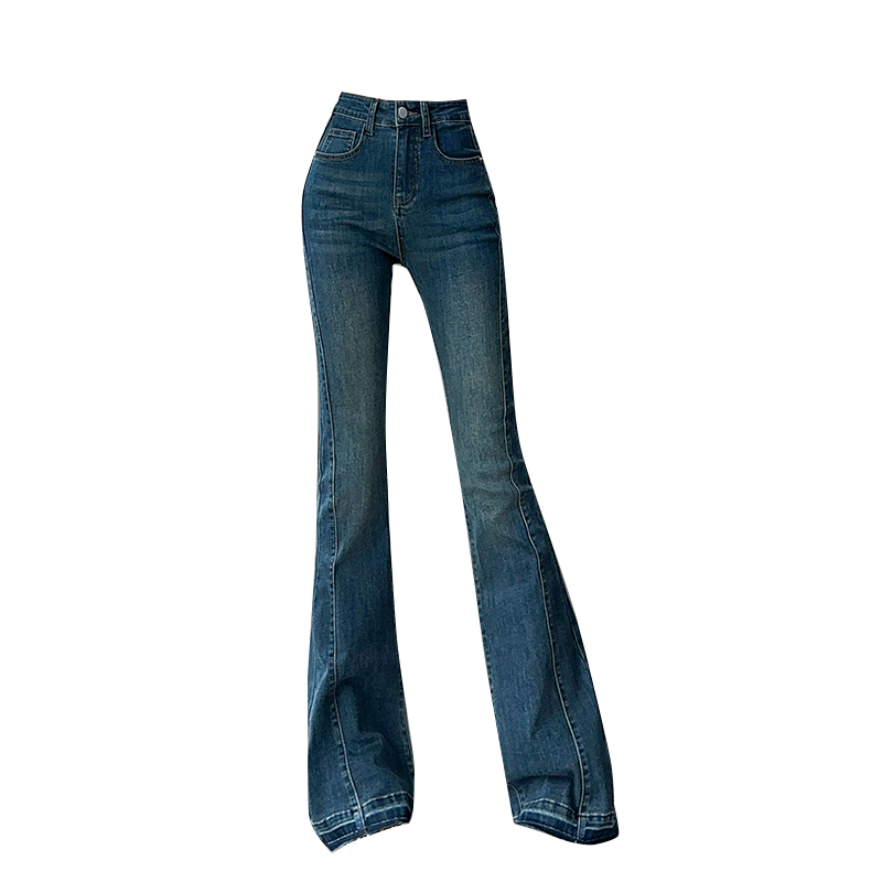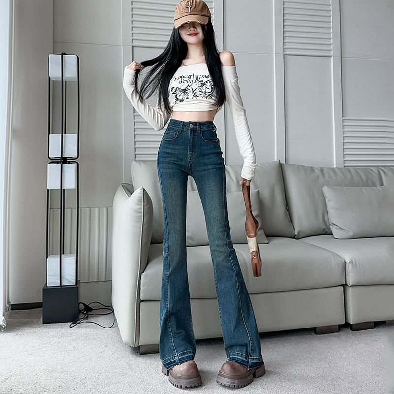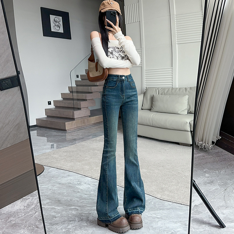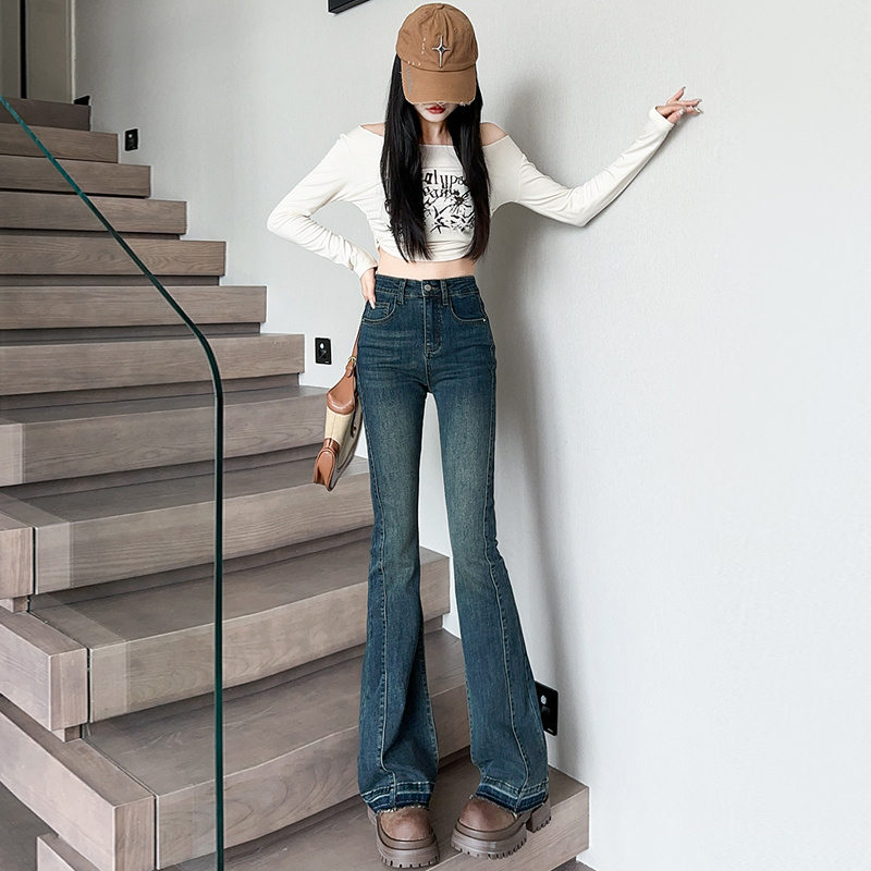 高腰显瘦弹力马蹄裤 毛边撞色复古微喇牛仔裤 新款 春秋季 子 女长裤