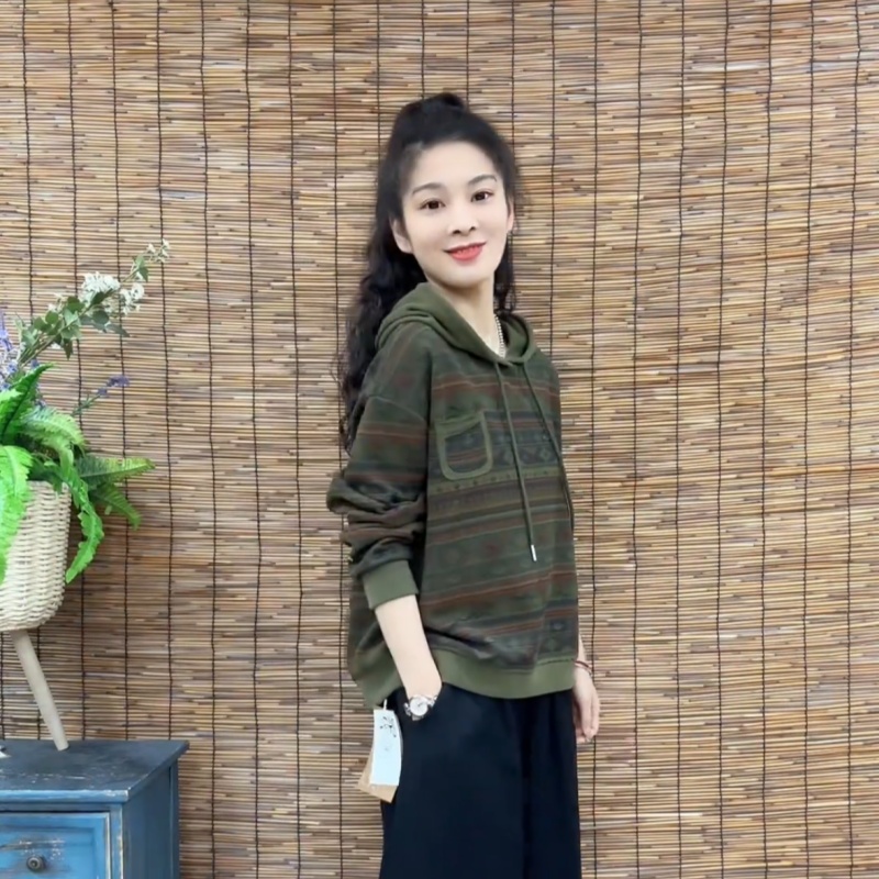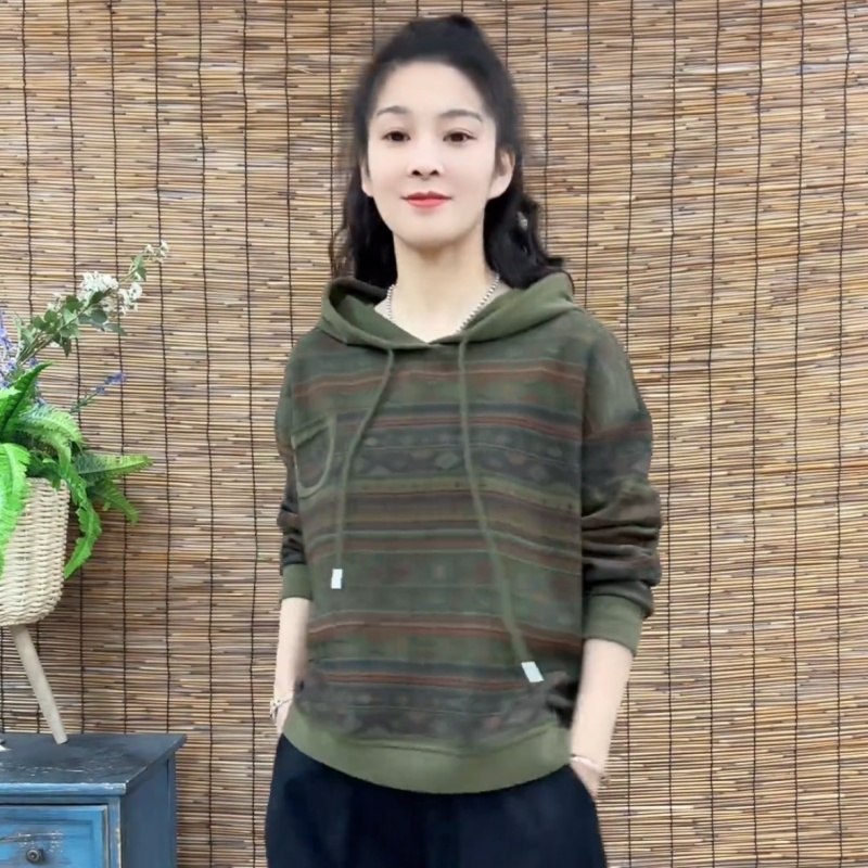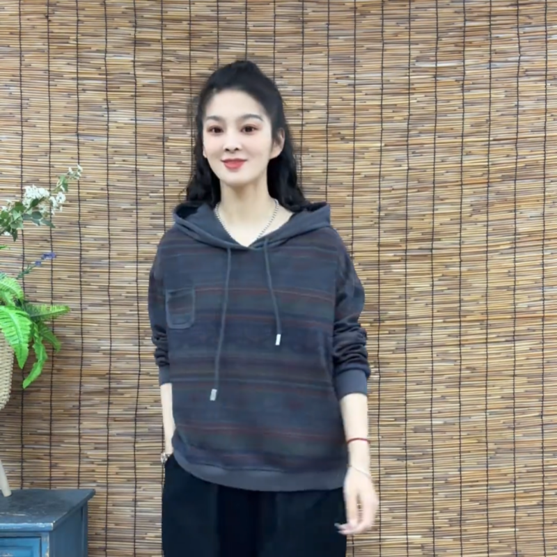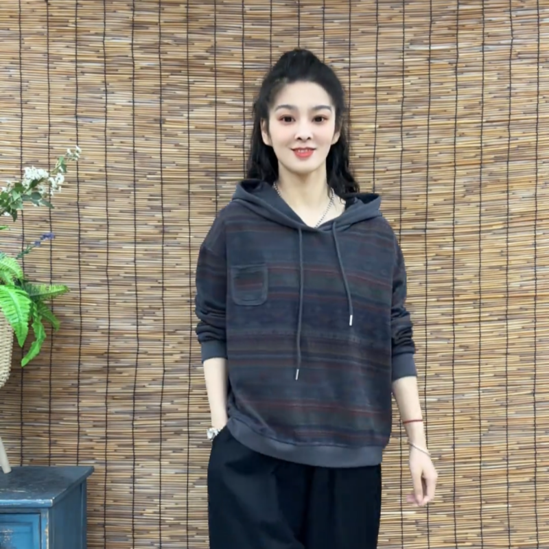 2025春秋季 条纹拼接贴布口袋印花洋气卫衣宽松连帽外穿上衣女 新款
