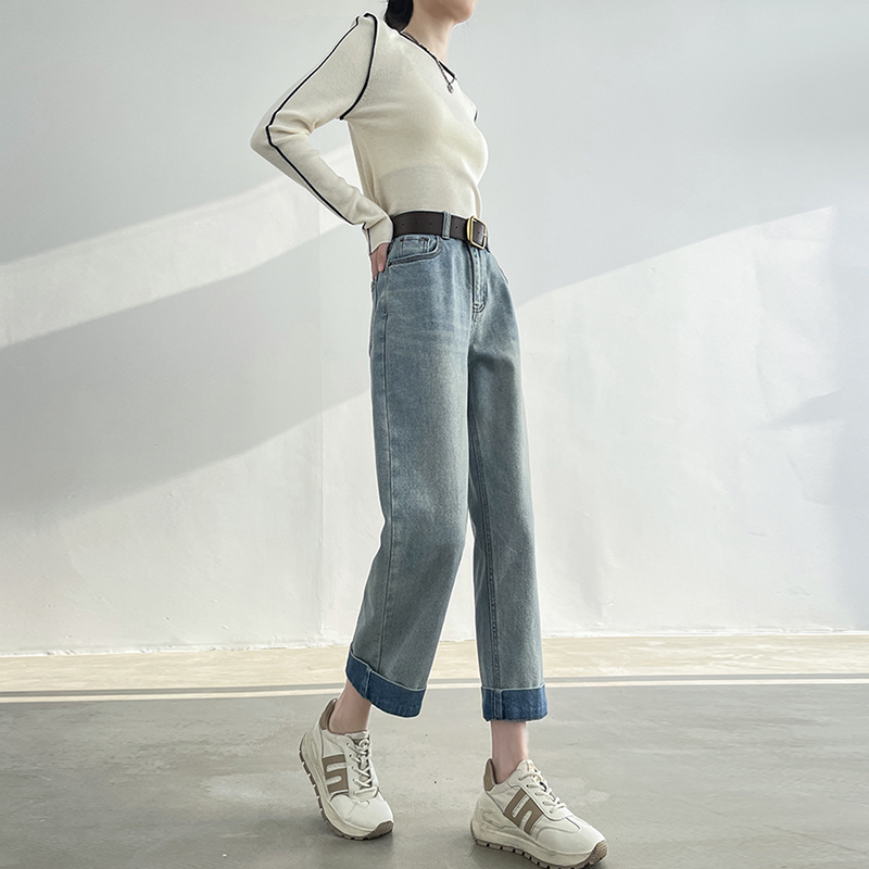 直筒裤 翻边复古九分牛仔裤 高腰宽松显瘦小个子八分窄版 新款 女春季
