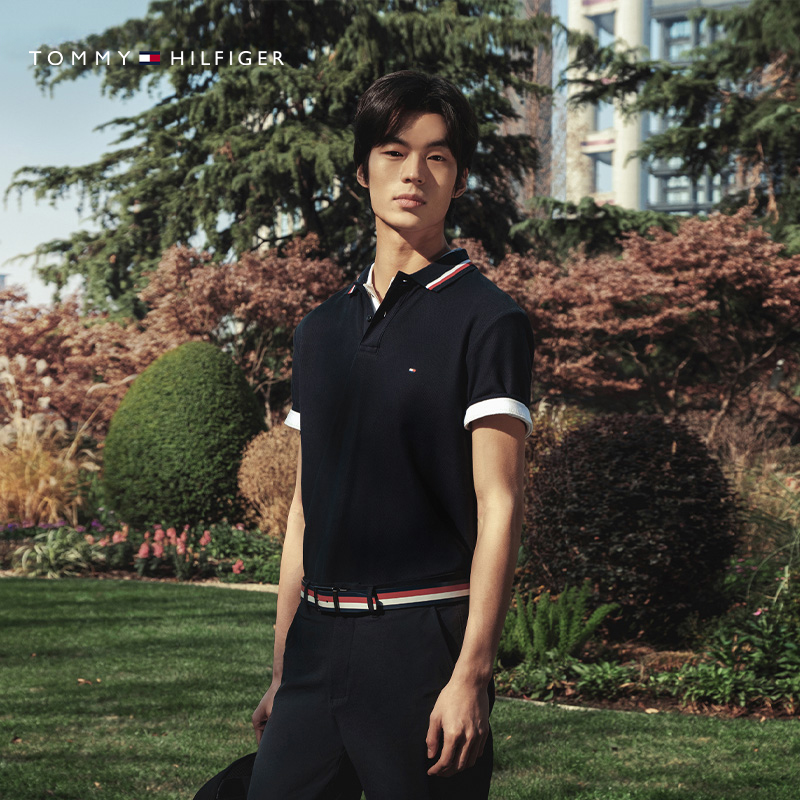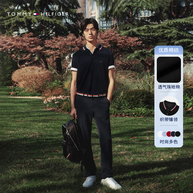 Tommy25春夏新款 休闲通勤镶边翻领POLO 男透气珠地棉高级撞色短袖
